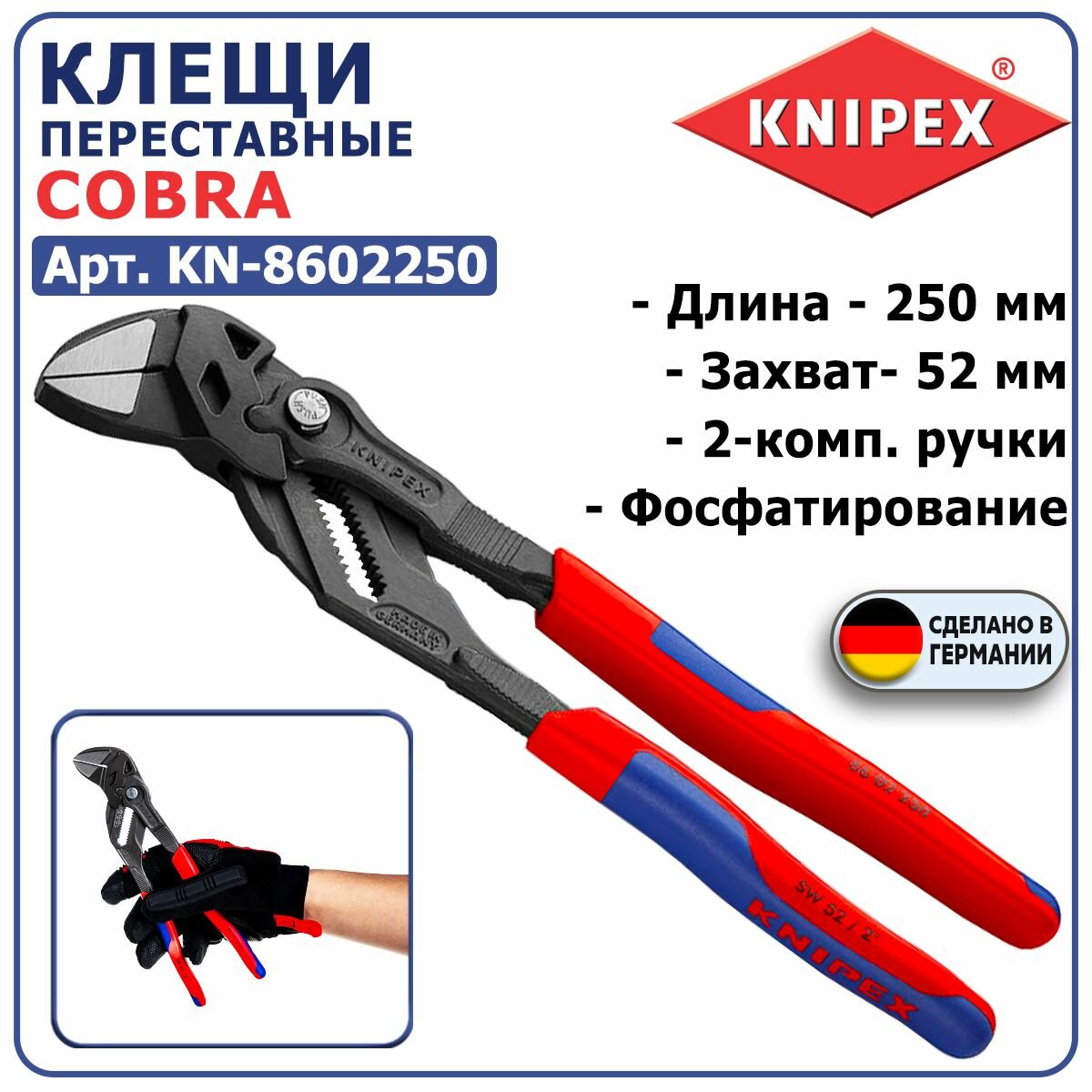 Клещи переставные-гаечный ключ, 52 мм, 250 мм KNIPEX KN-8602250 подарок на день рождения мужчине, любимому, папе, дедушке, парню