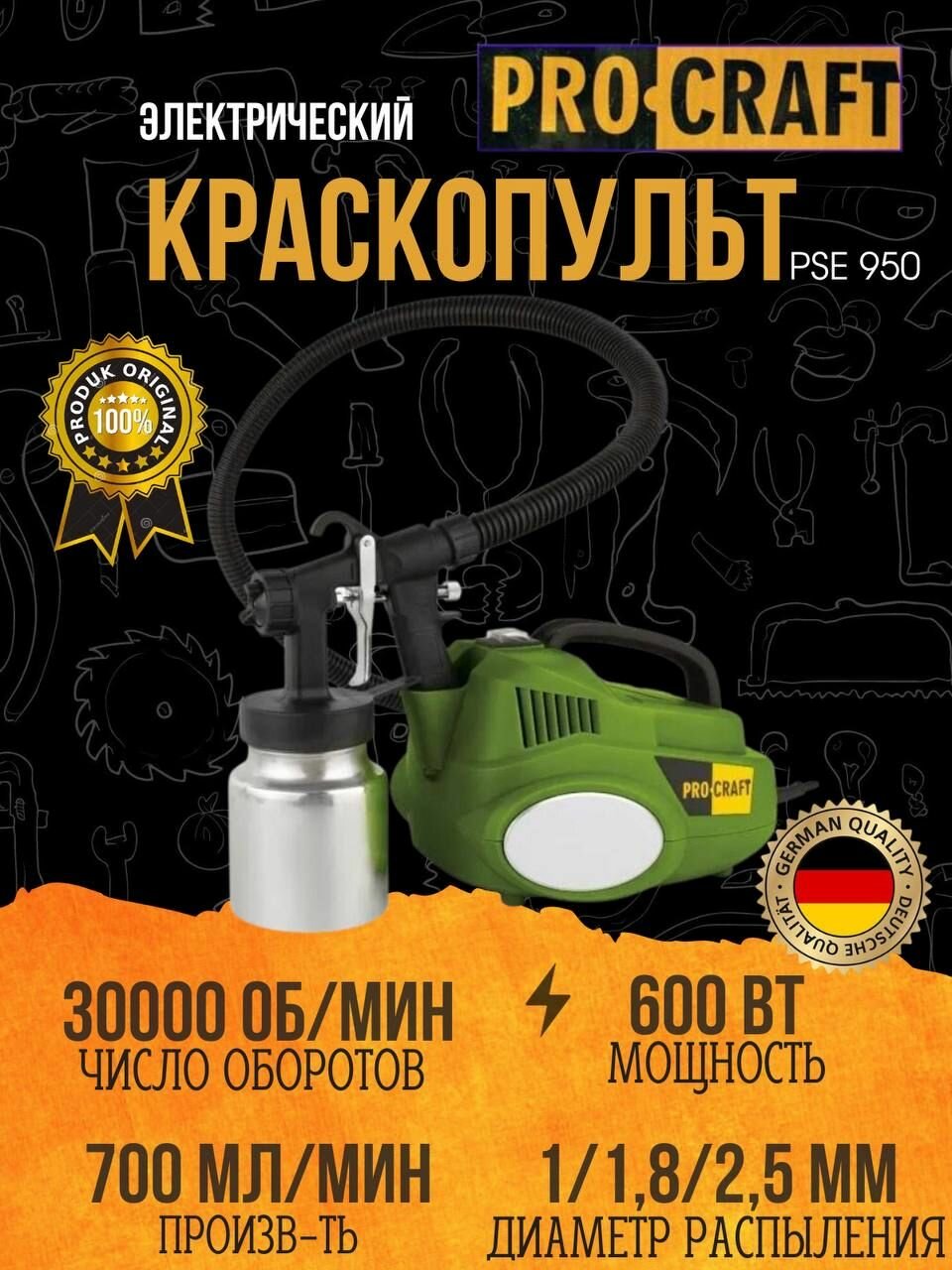 Краскопульт электрический Procraft PSE950, 700 мл/мин, 950Вт, 30,000об/мин, Вязкость 100