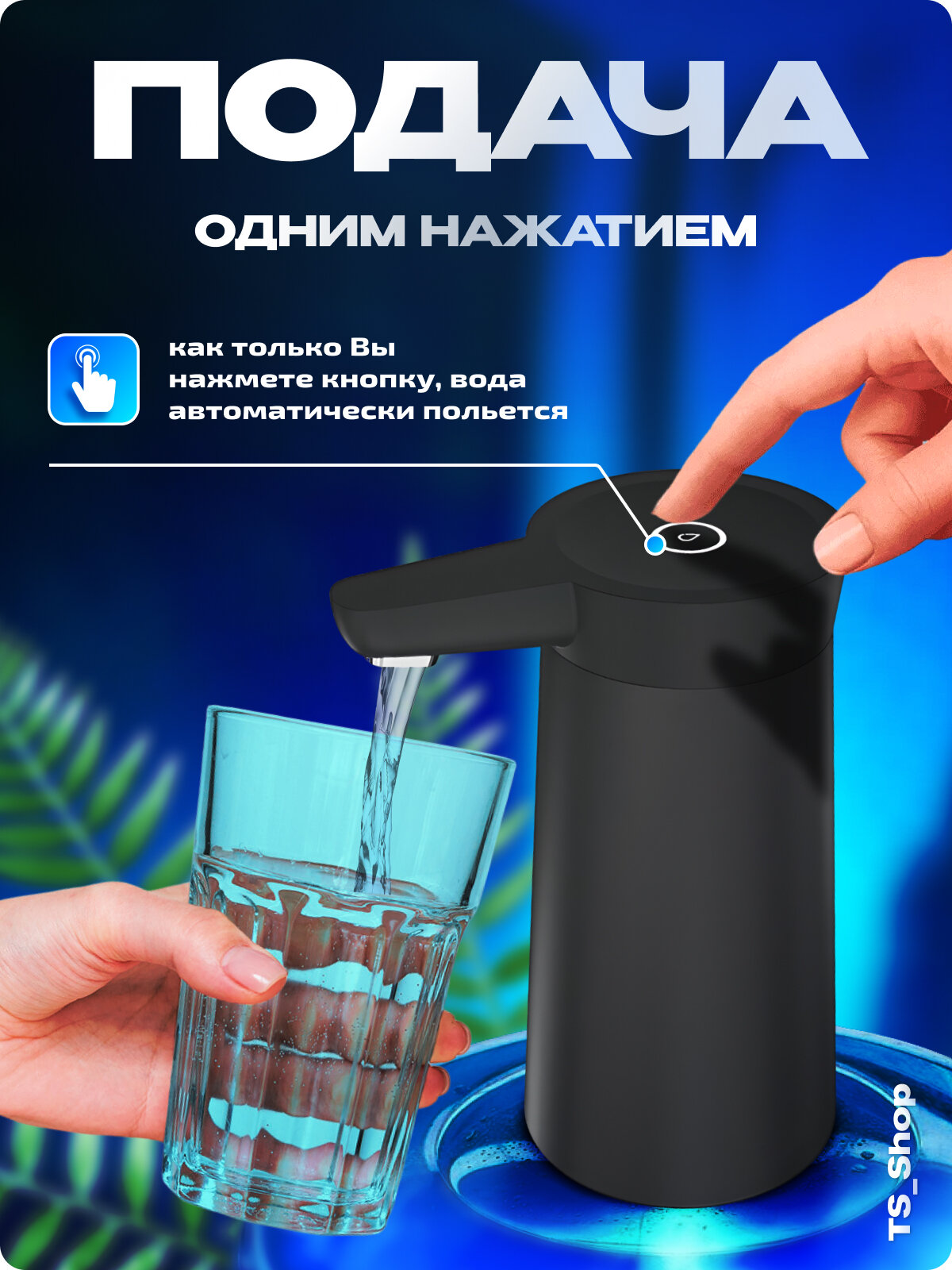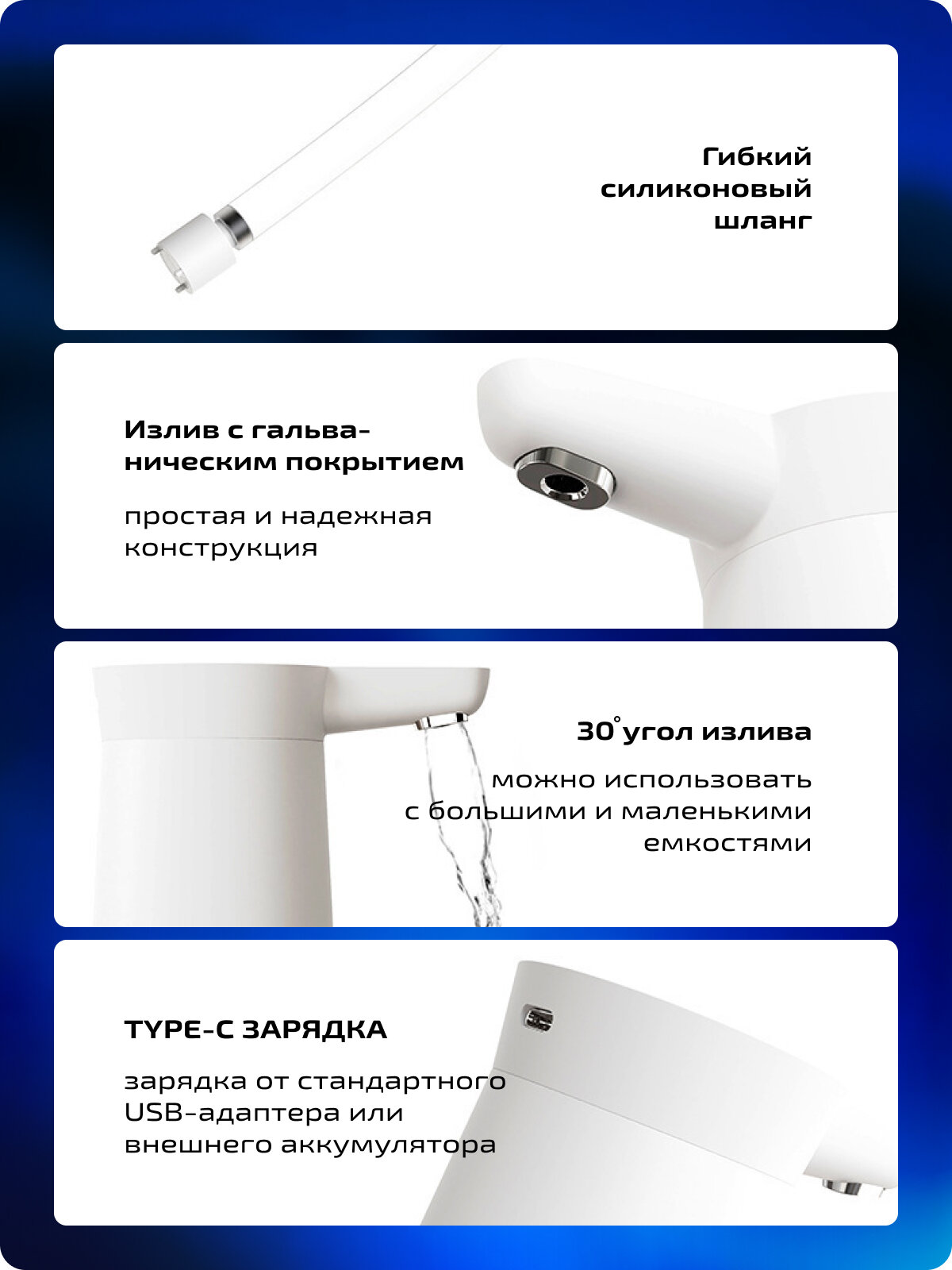 | Плюсы: | Долго держит зарядку, приятный внешний вид,зарядка type-c,легко устанавливать, шланг длинный достает до самого дна 20л бутыля. |