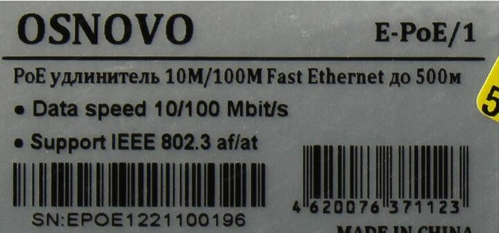 Удлинитель PoE Osnovo E-PoE/1 10/100M Fast Ethernet до 500м