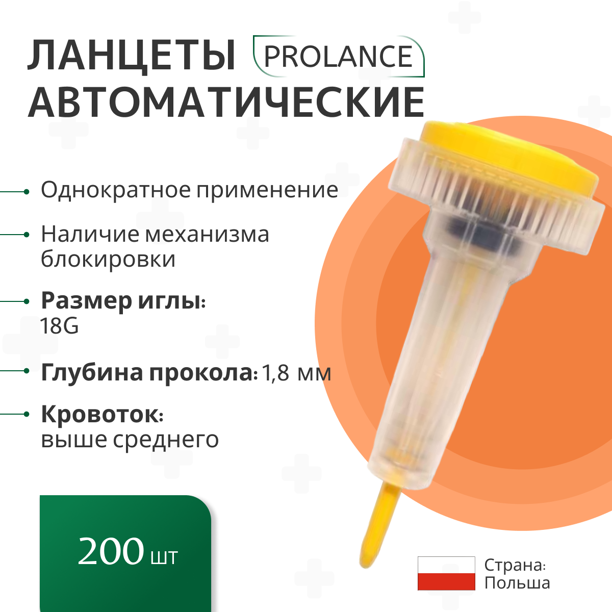 Автоматический ланцет Prolance для прокола пальца для анализов где требуется капиллярная кровь, желтый, глубина прокола 1,8 мм, 10 шт.