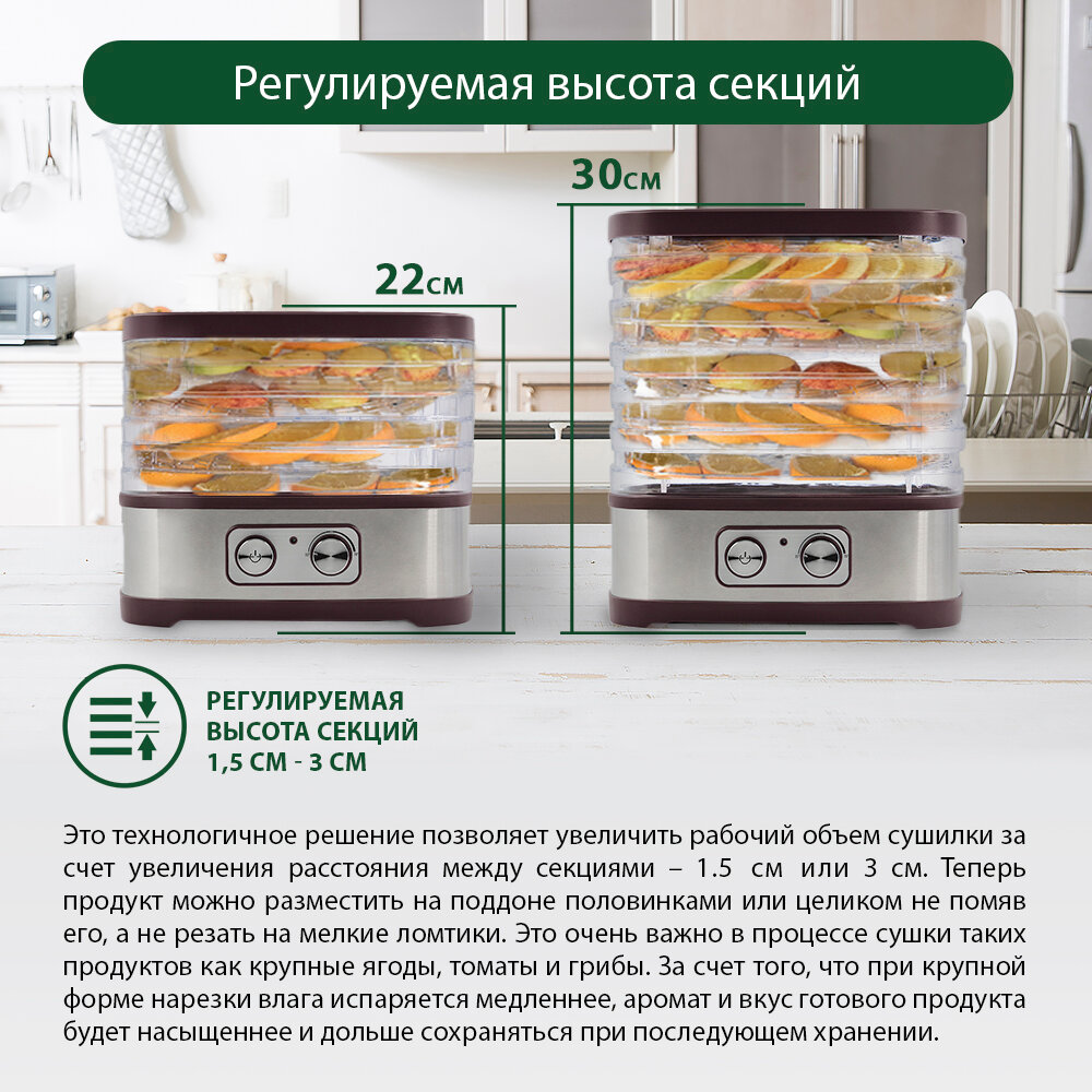 | Отзыв: | Очень довольна сушилкой, она не занимает много места, размеры ячеек подходят для большинства продуктов, также можно менять высоту поддонов. Сушу все что можно высушить от зелени до овощей и сухофруктов. Если сушу мелкие ягоды кладу дополнительно мелкоячеистую сетку на поддон. В управлении очень проста, никаких сложностей с ней не испытываю. За все время использования недостатков в работе не выявила. |