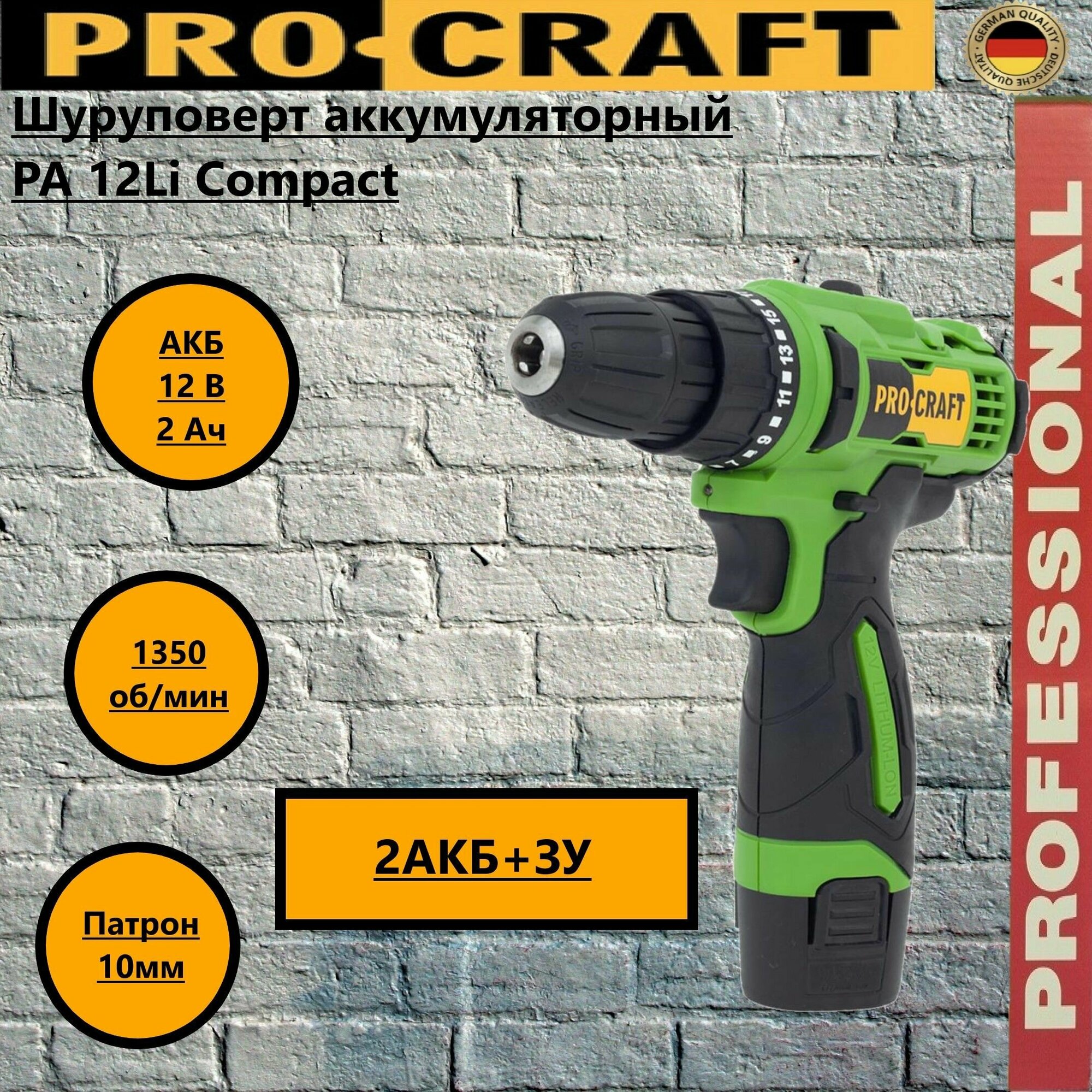 Шуруповерт аккумуляторный ProCraft PA 12 Li COMPACT, патрон 10мм, 1350об/мин