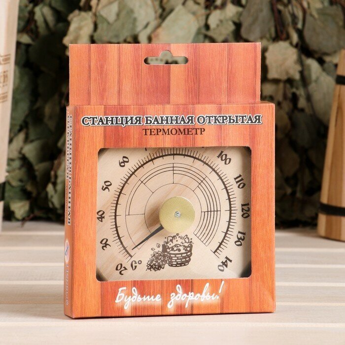 Деревянный термометр "Станция банная" открытая бытовая, от 0 до +140 С ,
