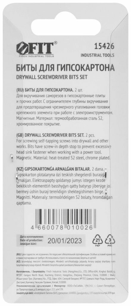 Насадки д/быстрого завинч.самор.по гипр., набор 2 шт, сталь S2 Профи, PH2 x 50 мм | код.15426 | FIT (10шт.в упак.)
