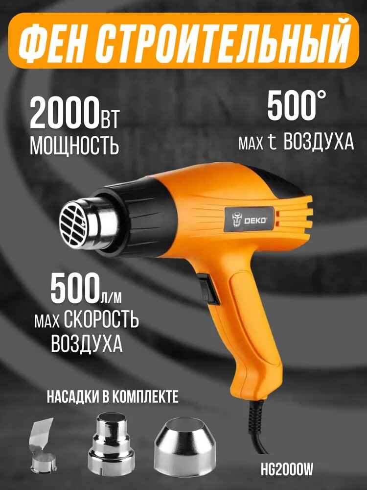 Deko Строительный фен Hg2000w, 2000Вт, 2 скорости, защита от перегрева063-4166 .