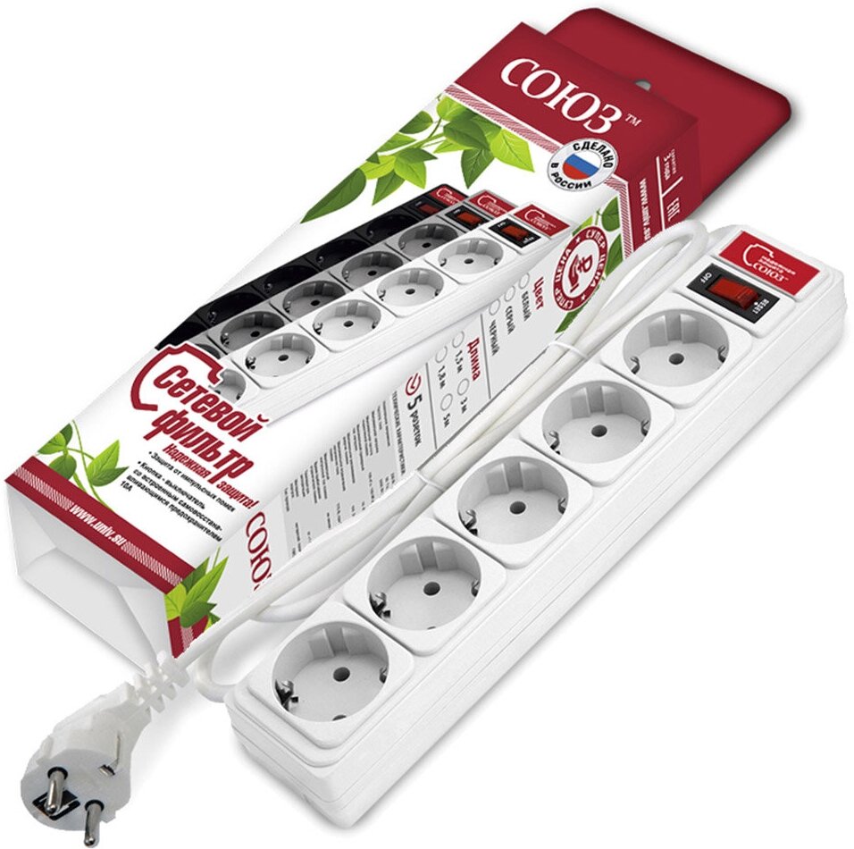 Сетевой фильтр Союз 1324, 5 розеток, с/з, 10А белый 1.5 м