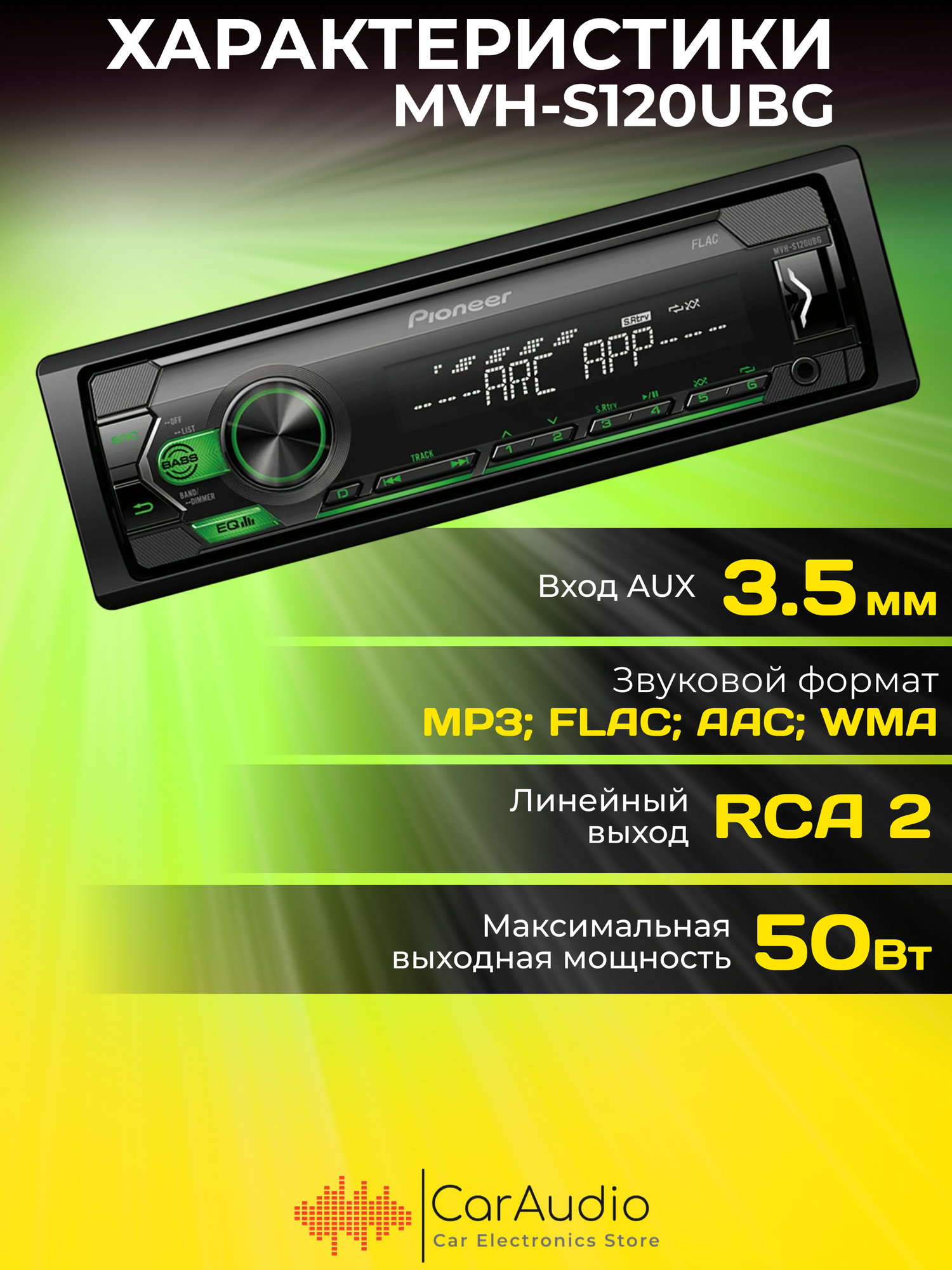 Автомагнитола Pioneer MVH-S120UBG, 1 DIN, USB/AUX, 4х50Вт, зеленая подсветка