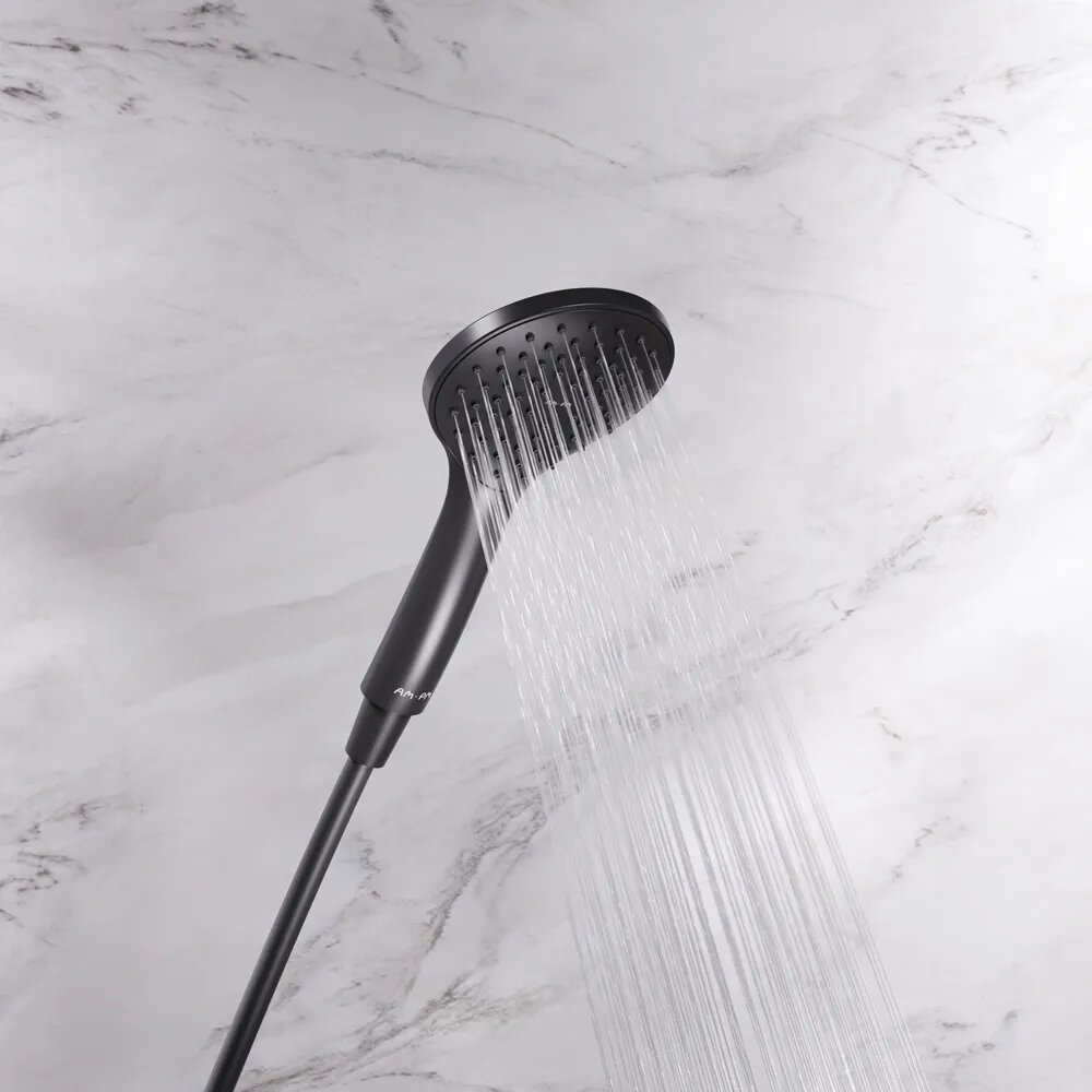 Душевая система с тропическим душем черная AM.PM Jump, душевые системы для ванны без смесителя, цвет черный, поворотный верхний душ 220мм, лейка 110мм, регулируемая по высоте штанга, Германия