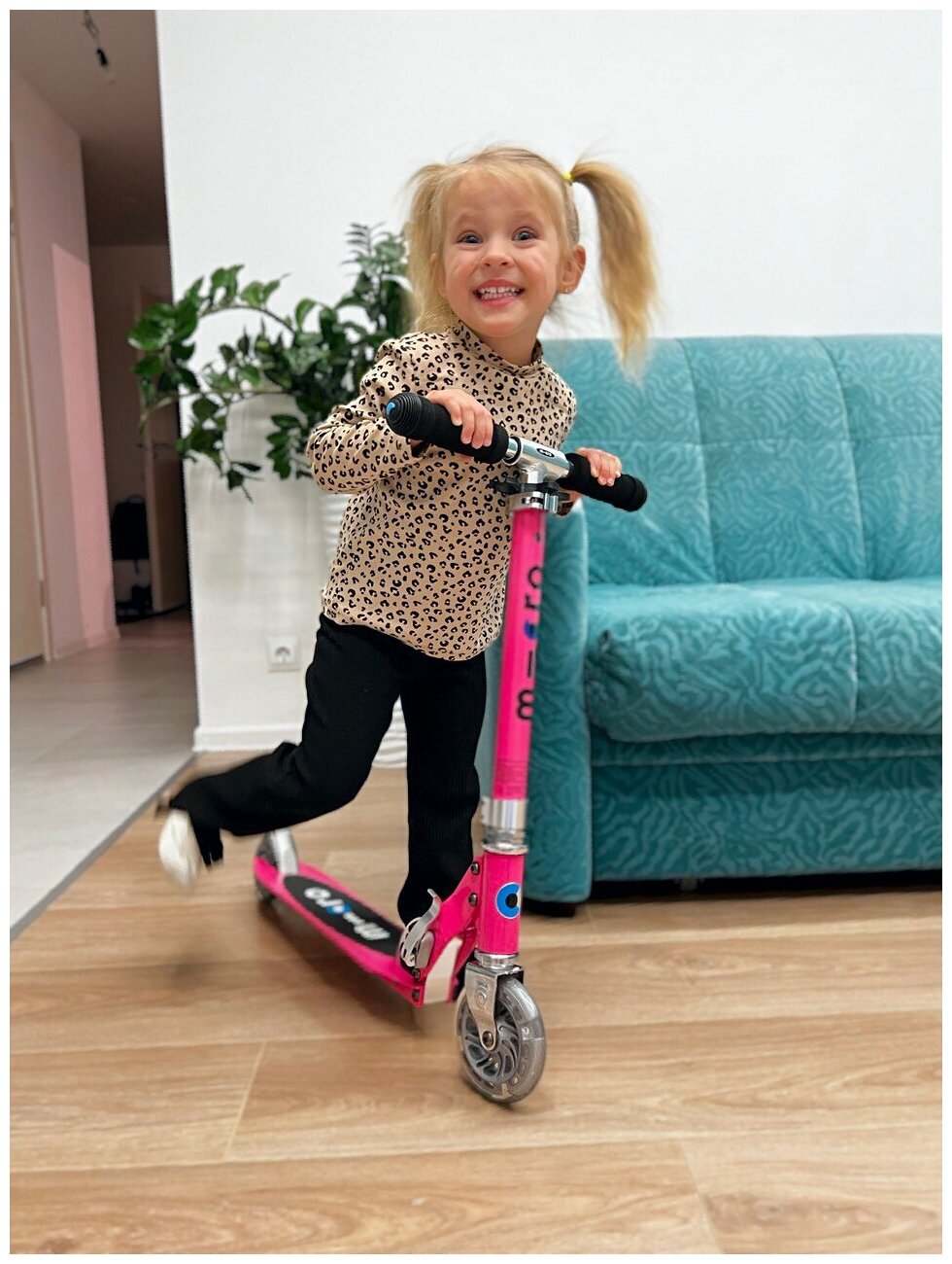 Сын в 5 лет встал и поехал, дарили перед поездкой в другой город, 18 км за день ребенок с удовольствием откатал) Я тоже покаталась, при росте 164 и весе 50 с самокатом ничего не случилось и мне было комфортно ехать с самым высоким положением руля. Механизм складывания удобный, колеса светятся при езде, я, кстати, не заметила люфт ручек, хотя ожидала его учитывая конструкцию. Заказала еще ремень micro для переноски и сумку для транспортировки чтобы не пачкать багажник. Обошелся в 11292?, считаю цену на самокат оправданной) |