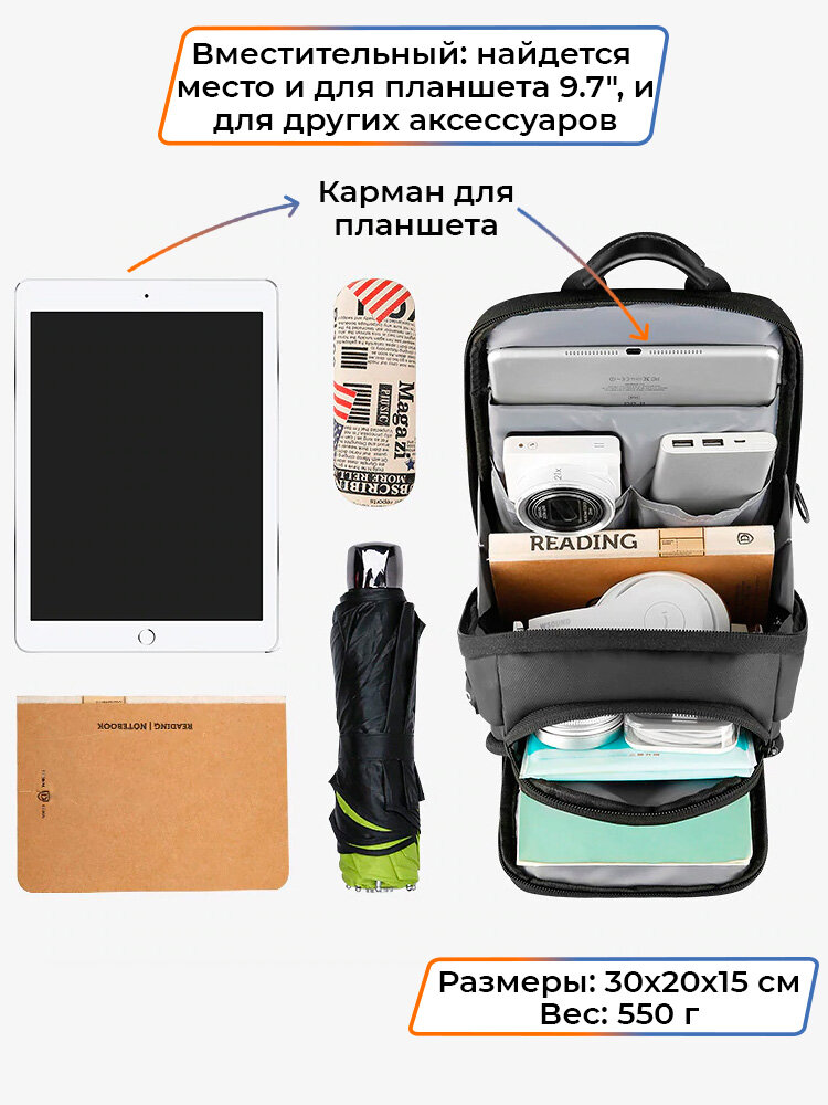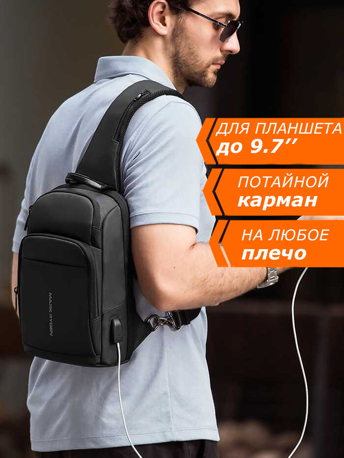Рюкзак мужской городской небольшой 6.5л для планшета 10" через плечо Mark Ryden MR7618 черный, влагостойкий, с USB портом, молодежный