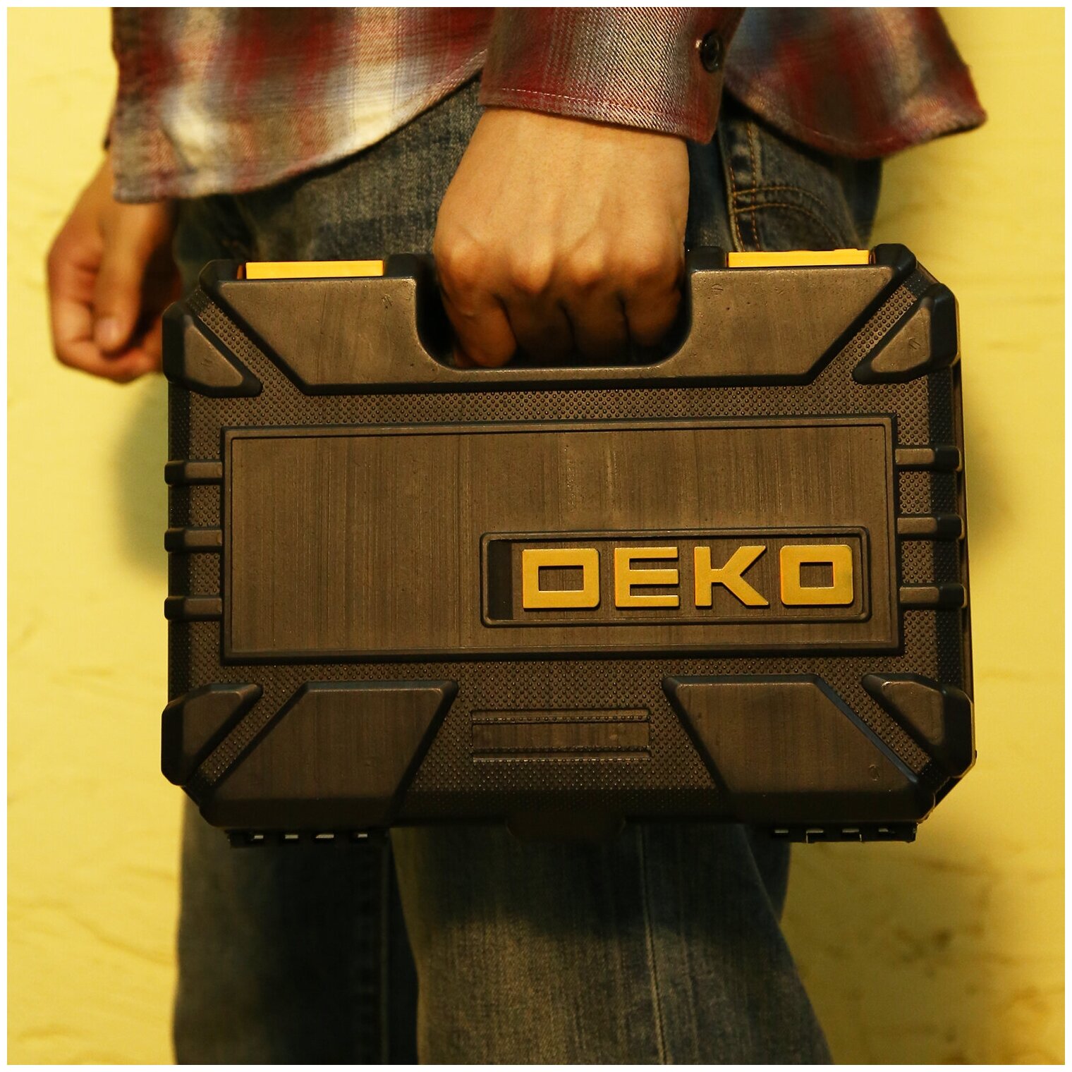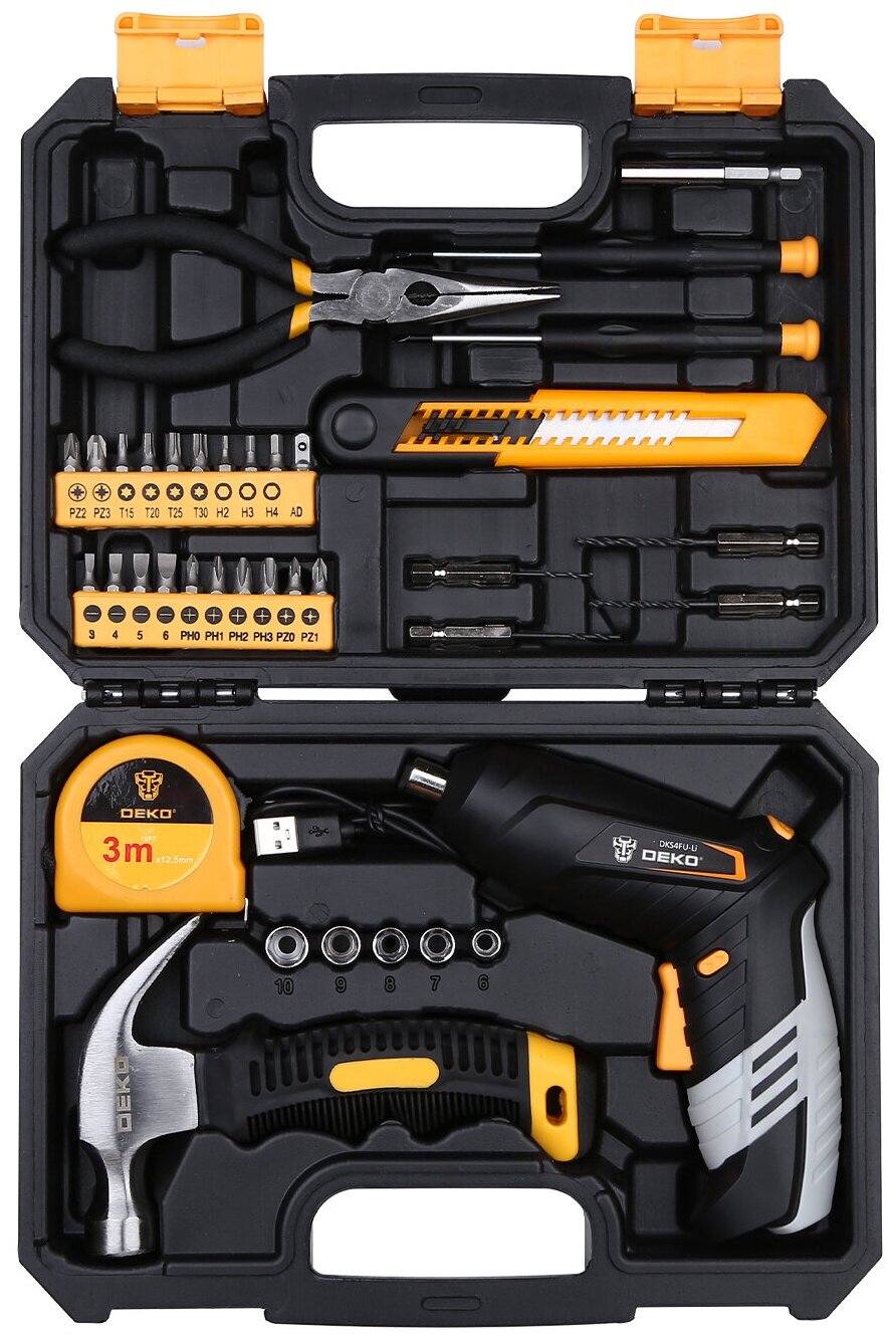Аккумуляторная отвертка Deko DKS4FU-Li в кейсе набор инструментов 36 предметов черно-желтый