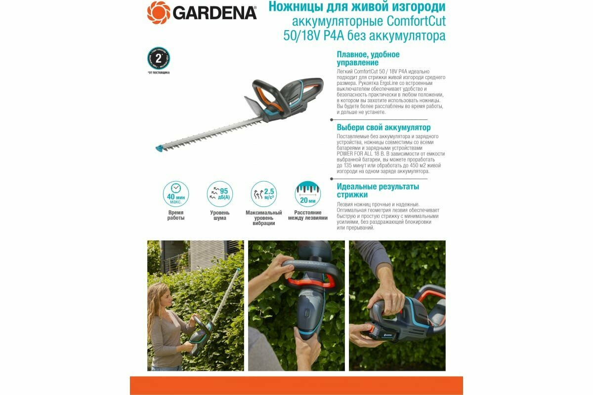Ножницы для живой изгороди аккумуляторные Gardena ComfortCut 50/18V P4A без аккумулятора 14730-55.000.00