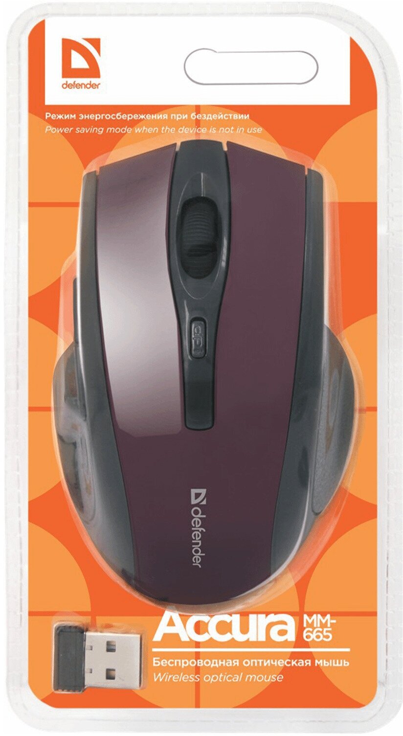 Мышь оптическая беспроводная Defender Accura MM-665, 5 кнопок + 1 колесо-кнопка, бордовая (52668)
