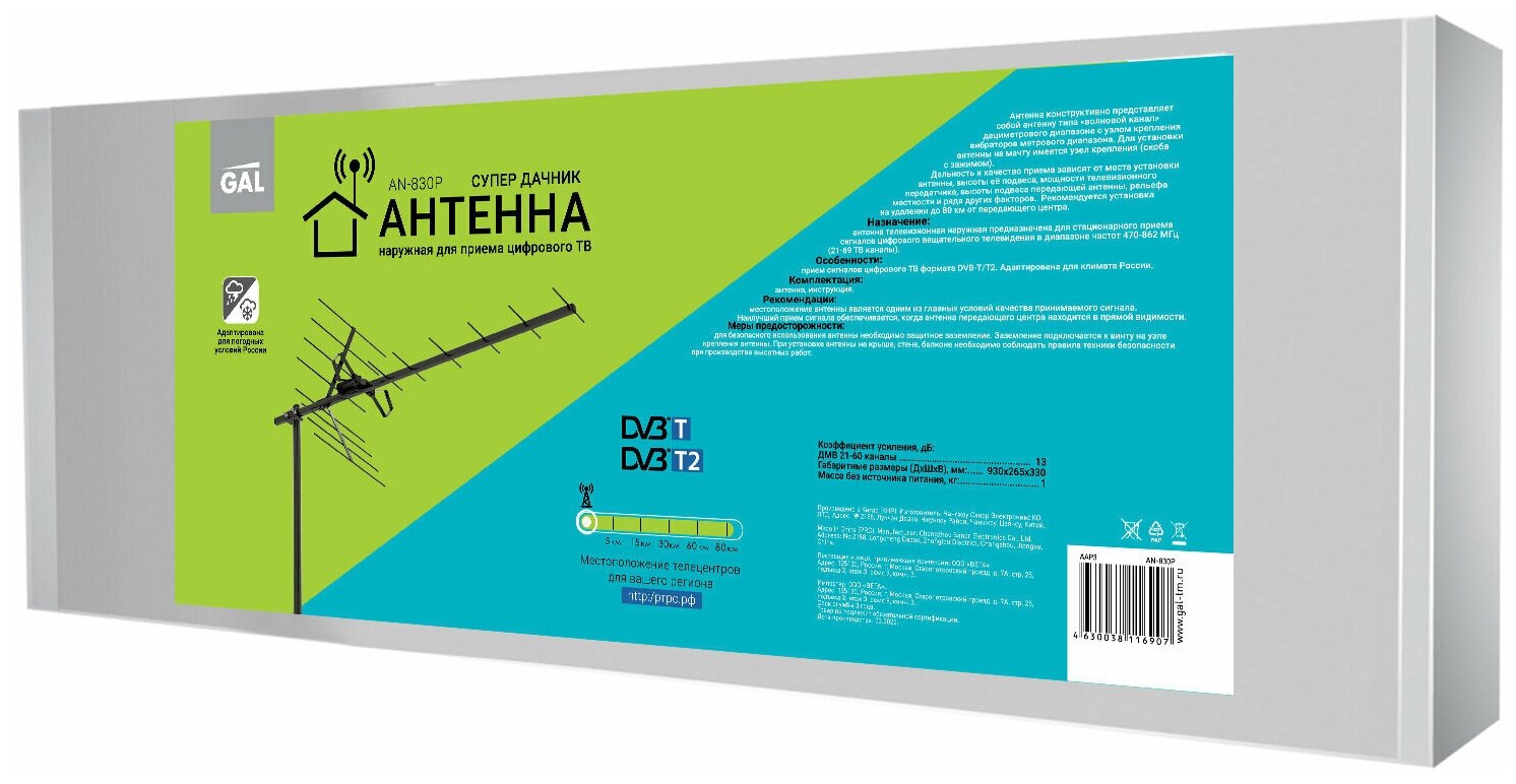 Антенна уличная GAL AN-830p Супер Дачник, DVB-T2, пассивная, для цифрового ТВ
