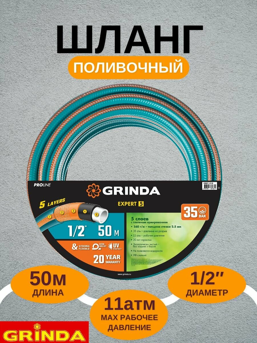 GRINDA EXPERT 5, 1/2″, 50 м, 35 атм, пятислойный, текстильное армирование, поливочный шланг, PROLine (429007-1/2-50)