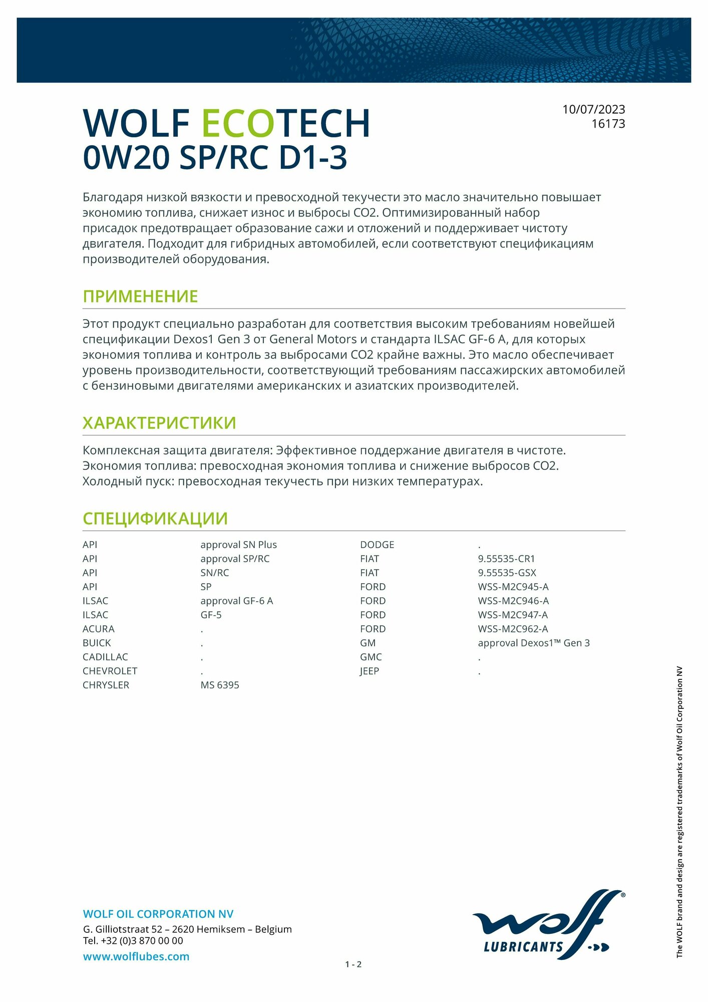 Масло Моторное Wolf Ecotech 0W20 Sp/Rc D1-3 20L Api Sp Api Sp/Rc; Fiat 9.55535-Gsx Ford Wss-M2c962-A Gm Dexos1™ Gen 3 Ilsac G...