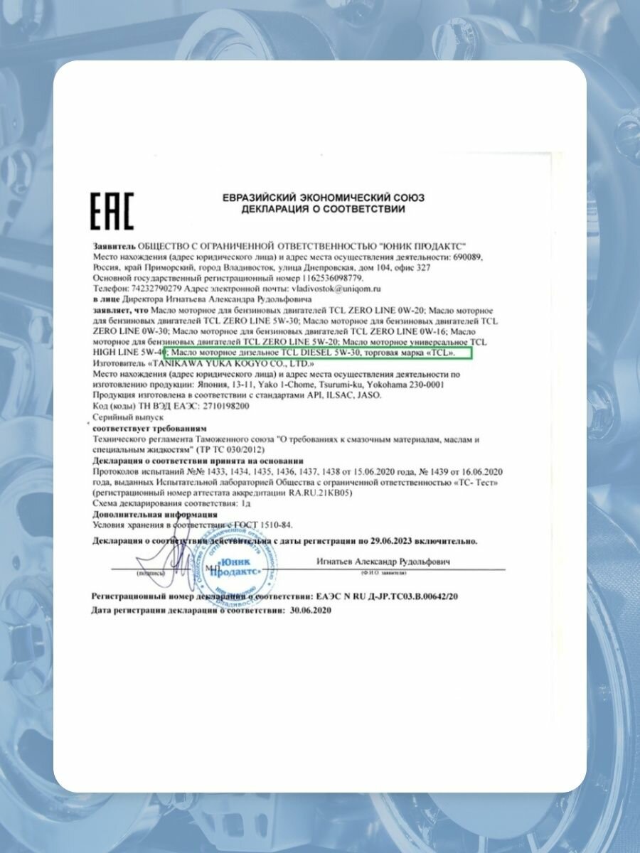 TCL D0040530 Масло для дизельных двигателей TCL Diesel, Fully Synth, DL-1, 5W30, 4л 1шт