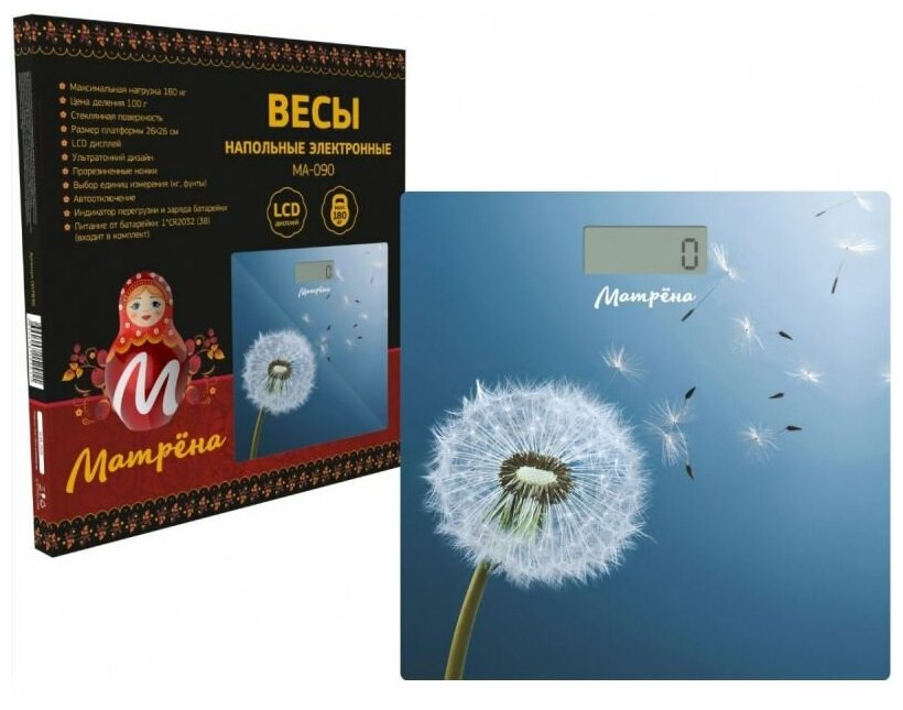 Купить Весы напольные эл. Матрена МА-090 Одуванчик (стекло)180кг, дел.100гр, 26*26см, CR2032 в компл. 7836 (арт. 767270)