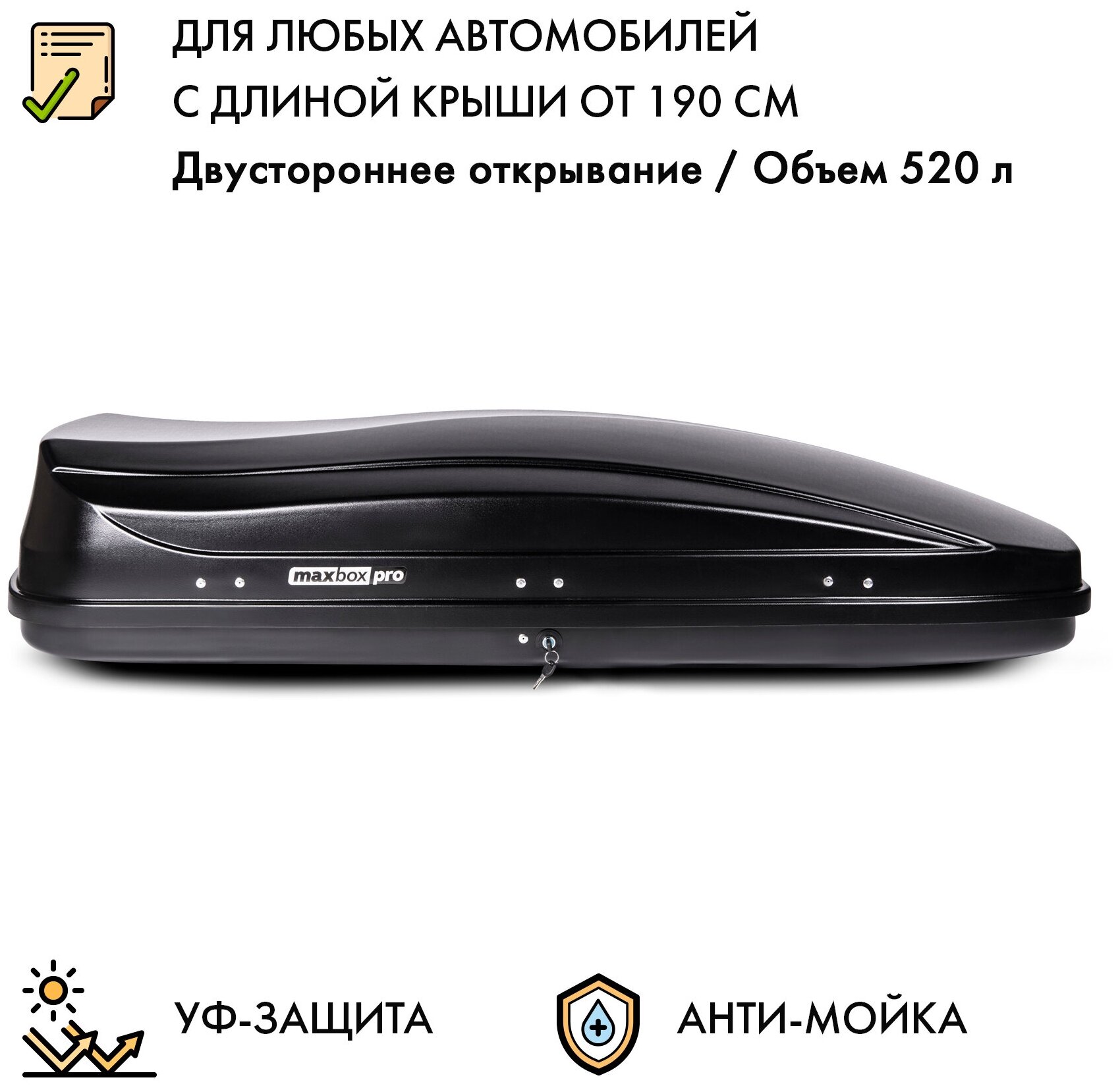 Бокс на крышу MaxBox Pro 520л, черный матовый,196х80х43, двустороннее открывание, арт:MBP-520-B