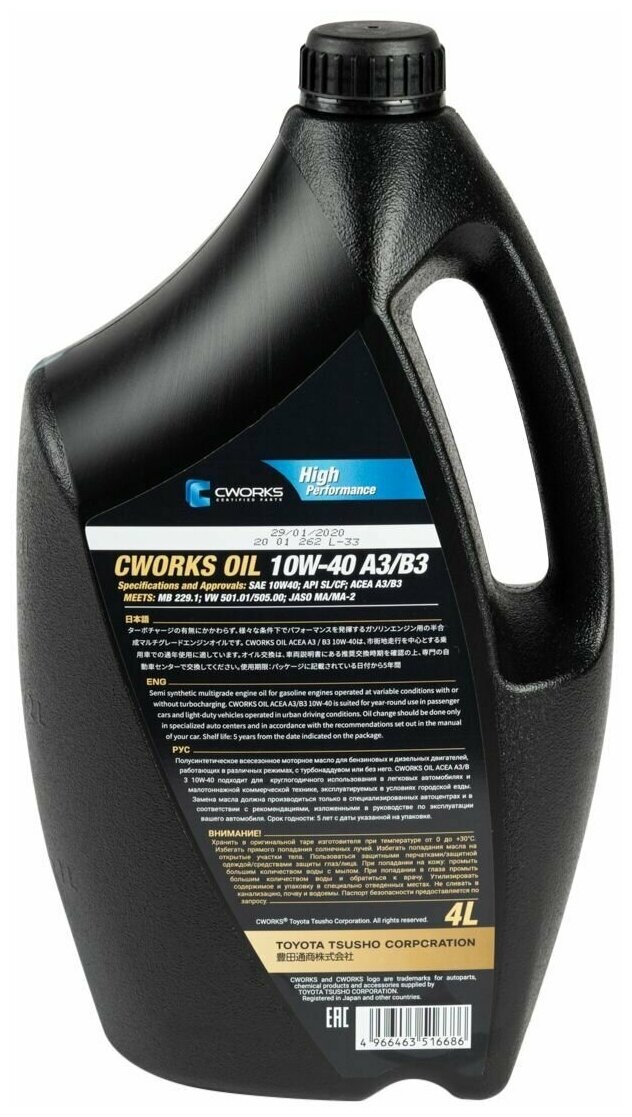 CWORKS A130R4004 CWORKS OIL 10W40 (4L)_масло мотор! полусинт.\ ACEA A3/B3, API SL/CF, JASO MA2, MB 229.1, VW 501/502