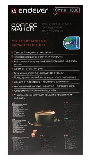 Гейзерная кофеварка электрическая ENDEVER Costa-1006 / 480 Вт / 300 мл / 3-6 чашек