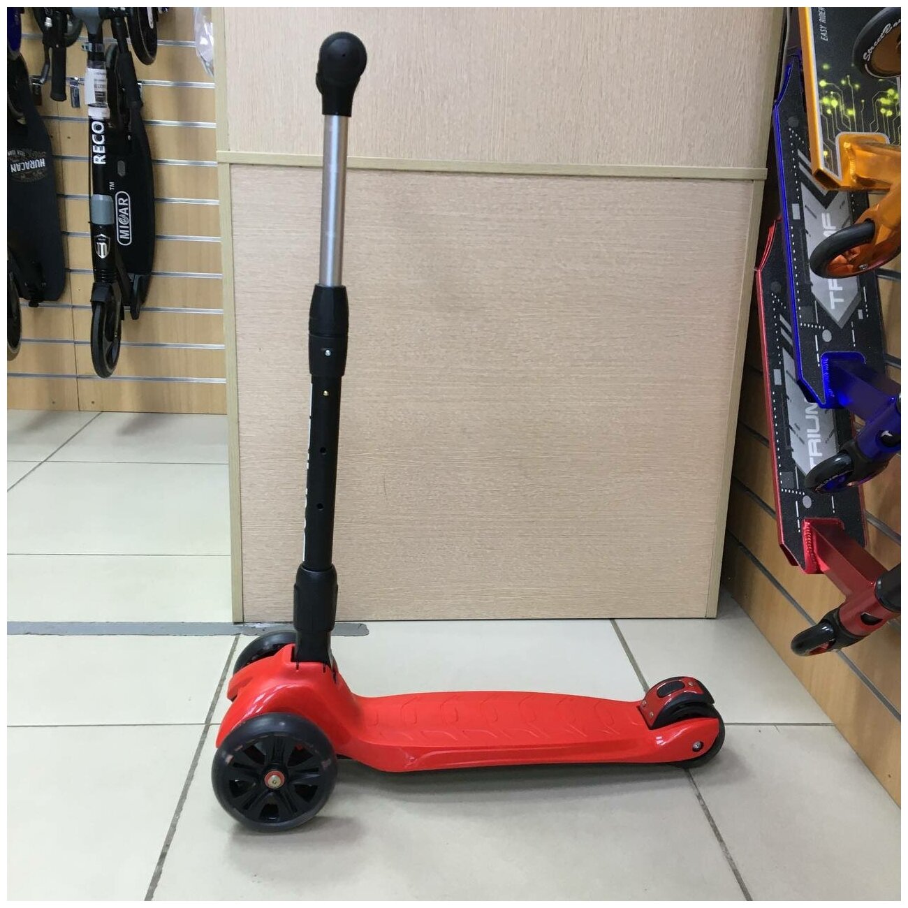 | Плюсы: | Качество сборки, прочность, внешний вид, регулировка руля по высоте, удобные ручки, двойное широкое колесо сзади, все колеса ярко светятся. |