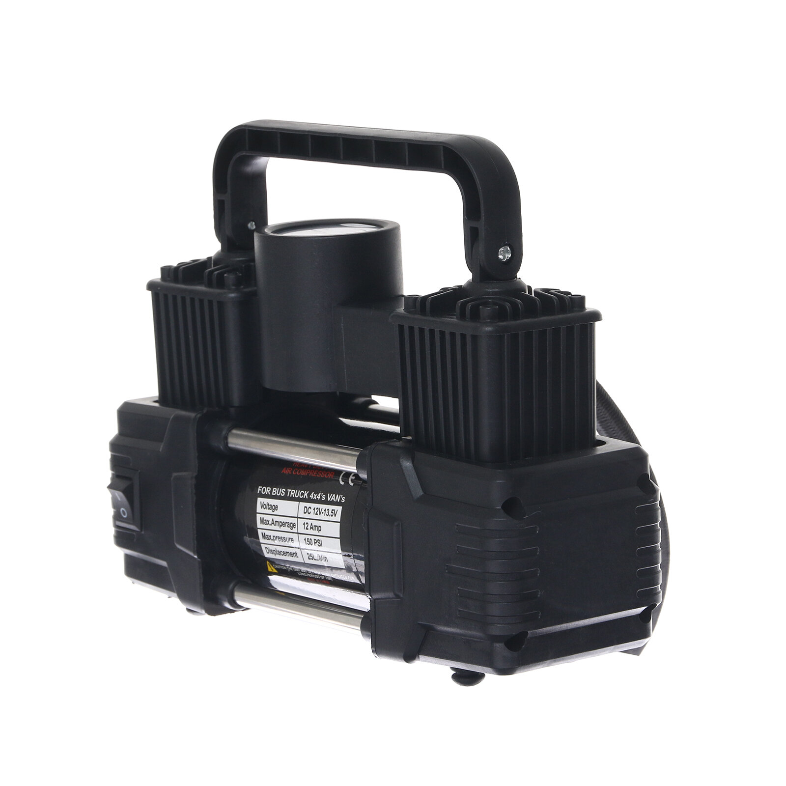 Компрессор автомобильный двухпоршневой, 12В, фонарь, 25 л/мин, сумка, черный