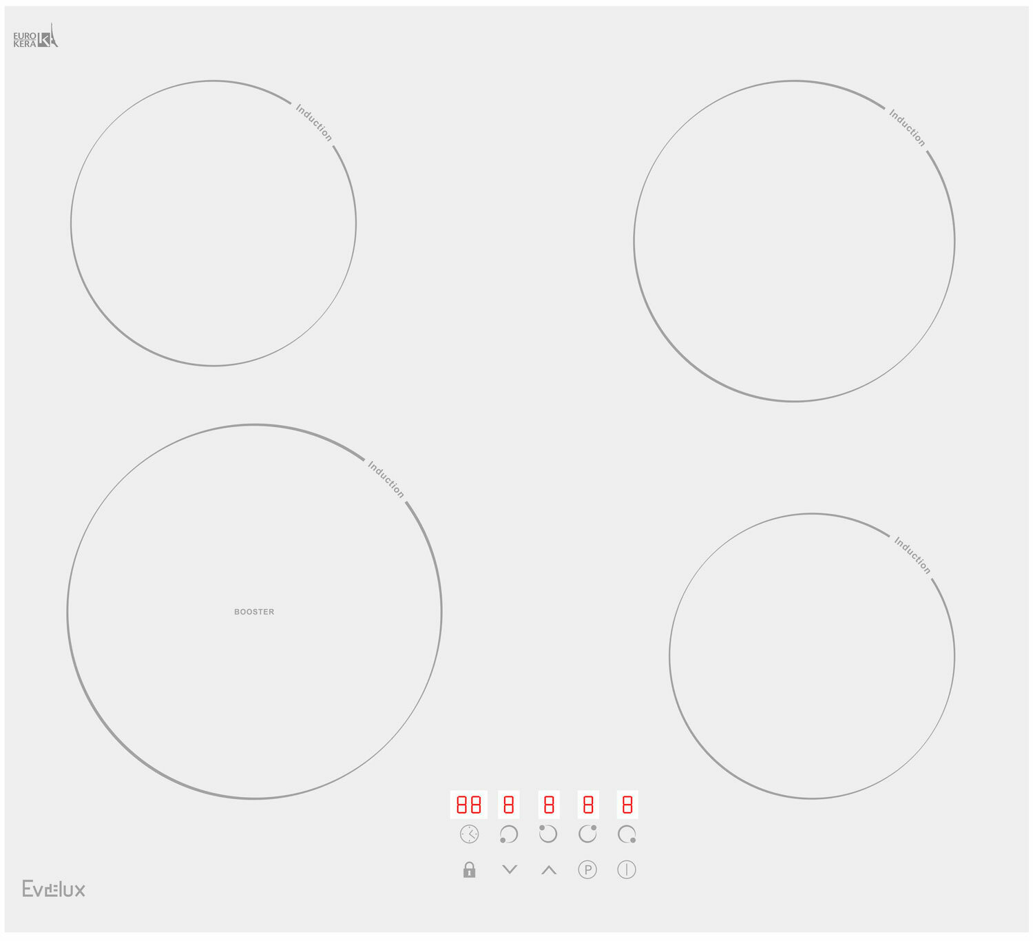 Индукционная стеклокерамическая варочная панель Evelux HEI 641 W, 9 уровней мощности, 4 конфорки Booster, кнопка блокировки панели, таймер конфорок, защита от перегрева