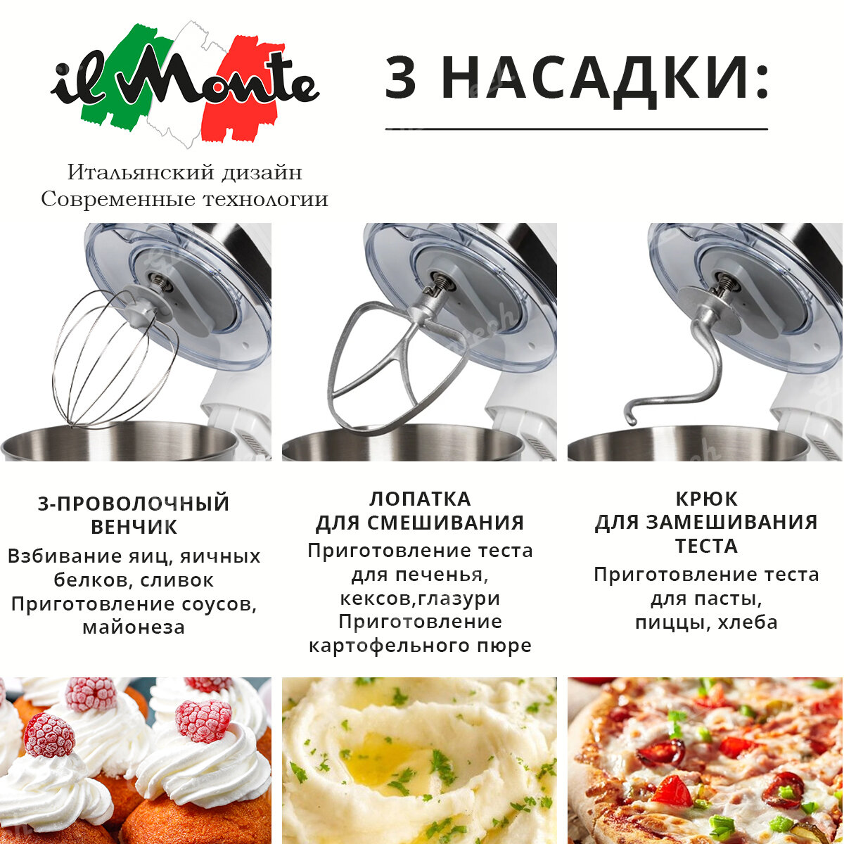 Планетарный миксер стационарный тестомес, 1000 Вт 3 насадки, Чаша 5 л 12 скоростей с плавной регулировкой, Режим импульс, il Monte SM-1002 IVORY