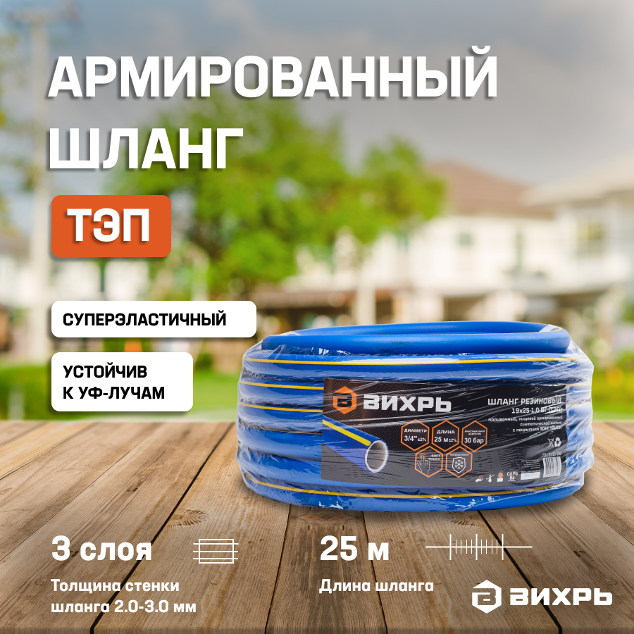 Резиновый армированный шланг Вихрь 19x25-1.0, 25 м ТЭП 73/7/2/28