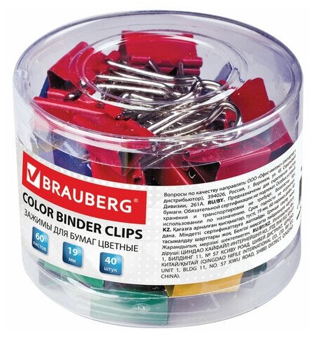 Купить Зажимы для бумаг BRAUBERG, комплект 40 шт., 19 мм, на 60 листов, цветные, в пластиковом цилиндре
