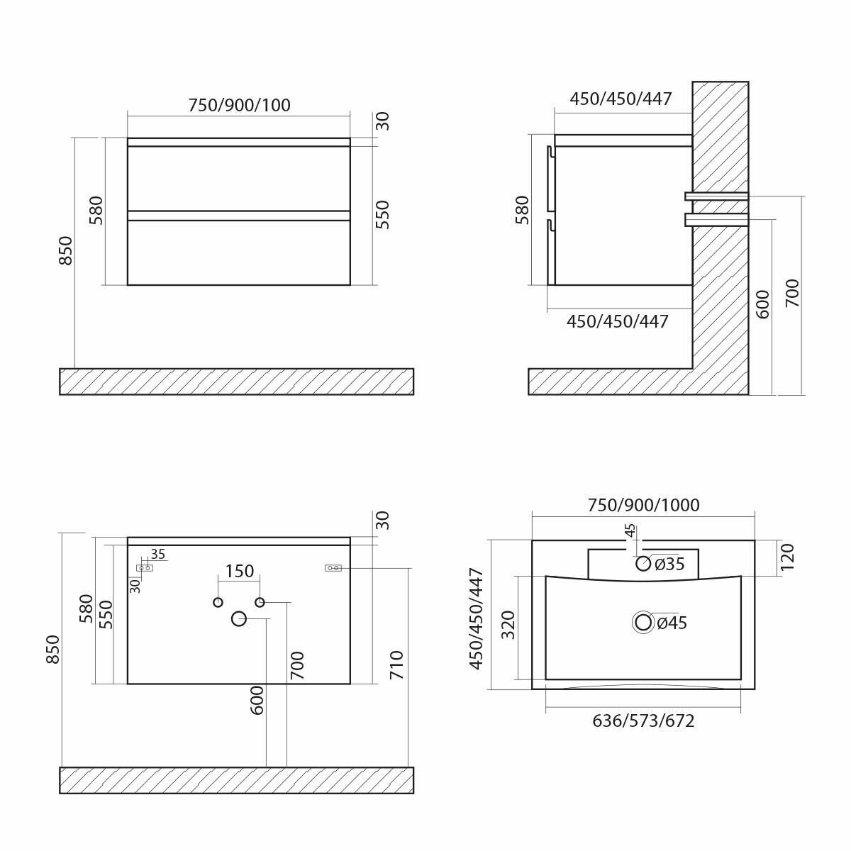 Art&Max PLATINO База под раковину подвесная с двумя выкатными ящиками, Серый матовый, 750x480x550 AM-Platino-750-2C-SO-GM