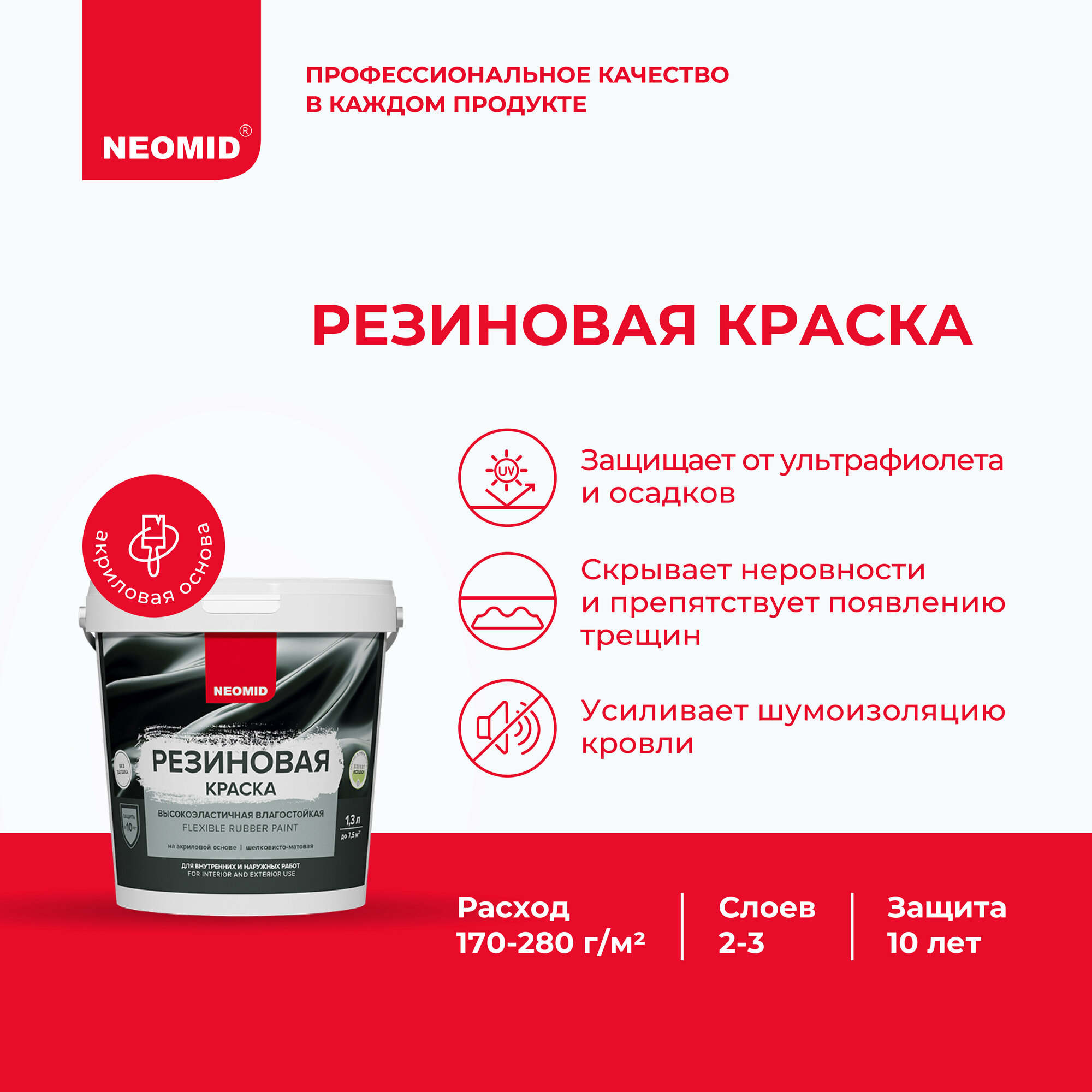Резиновая краска NEOMID Белый (1,3 кг) / Для фасадов, для стен и потолков в помещениях повышенной влажности