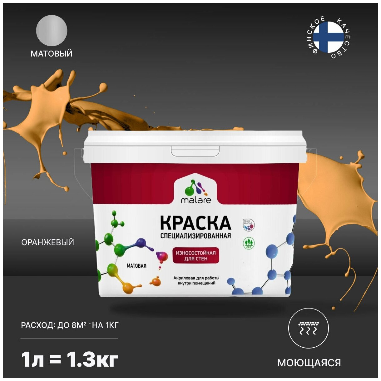 СохранитьКраска Malare Professional интерьерная износостойкая для стен и обоев, моющаяся, потолка, акриловая, быстросохнущая, матовая, оранжевый закат, (1л - 1.3кг). интересное: