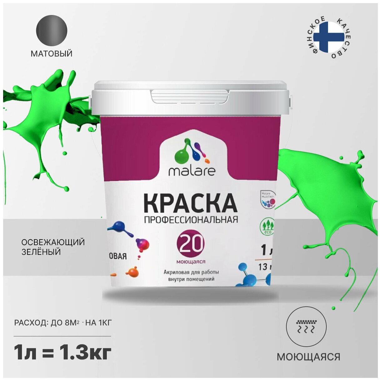 Купить Краска Malare Euro №20 интерьерная для стен, обоев и потолка, акриловая, быстросохнущая, моющаяся, матовая, освежающий зеленый, (1л - 1.3кг)