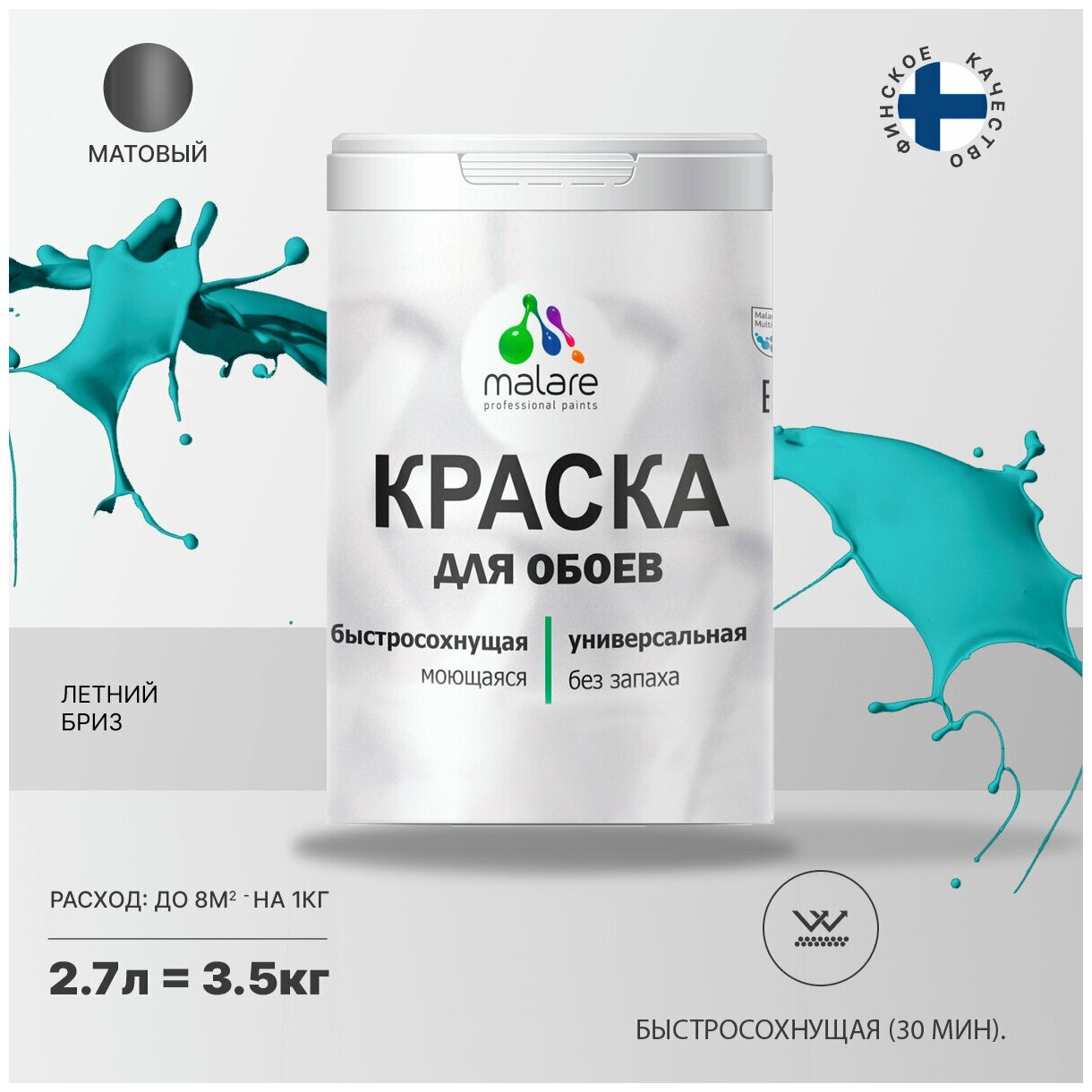 СохранитьКраска Malare для стен и обоев, потолка, деревянных и минеральных поверхностей, интерьерная акриловая, моющаяся, матовая, летний бриз, (2.7л - 3,5 кг) интересное: