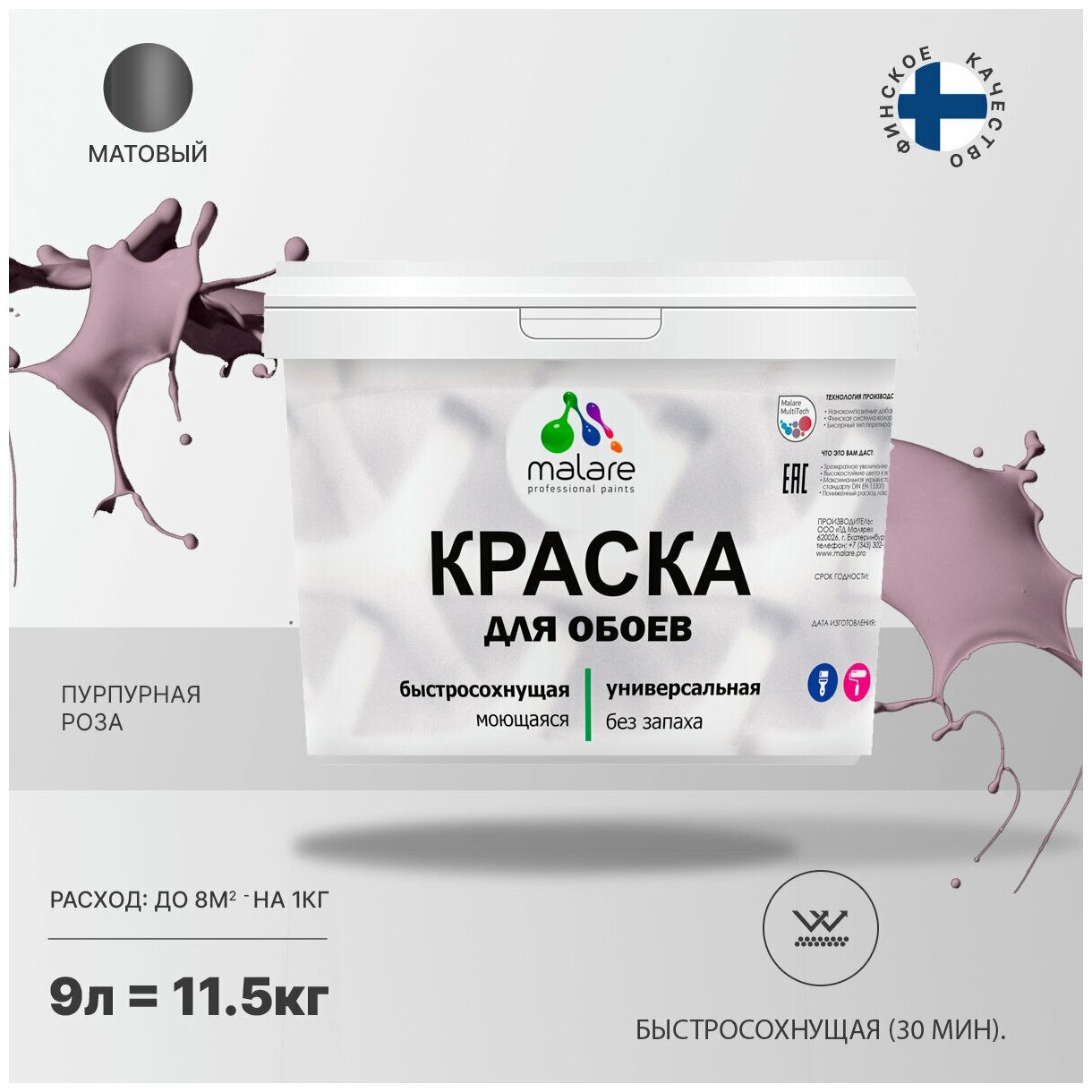 Купить Краска Malare для стен и обоев, потолка, деревянных и минеральных поверхностей, интерьерная акриловая, моющаяся, матовая, пурпурная роза, (9л - 11,5 кг)