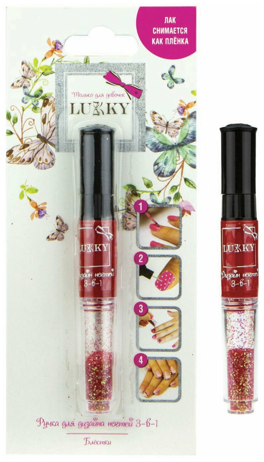 Т16774 Lukky 3-в-1 ручка для дизайна ногтей с лаком д.ногтей 6 мл красный 022 и блёстками 1,5 г,