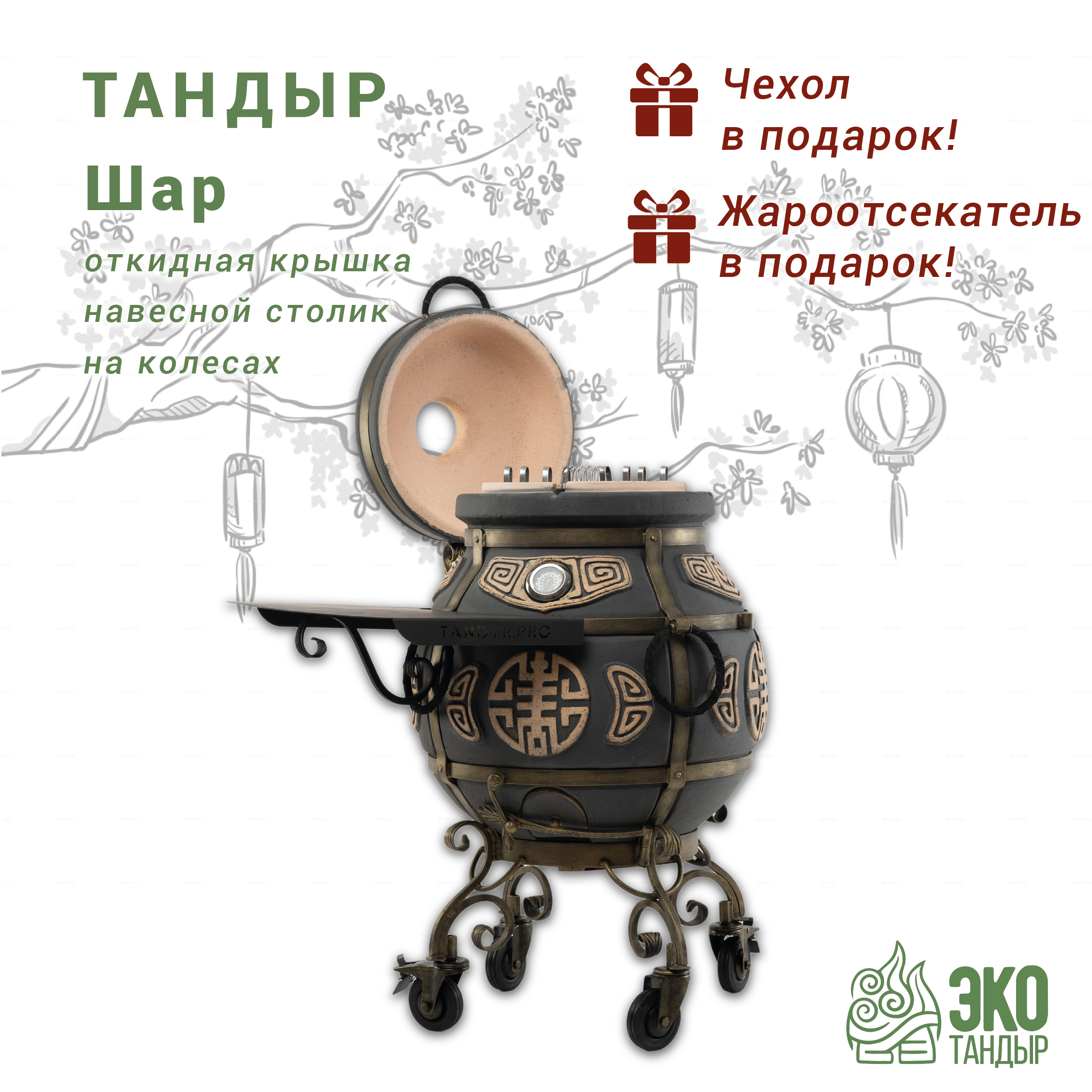 Тандыр ЭкоТандыр Шар (с механизмом открывания крышки, с одним столиком, на колёсах, цвет - графит) / чехол, сборник рецептов в подарок