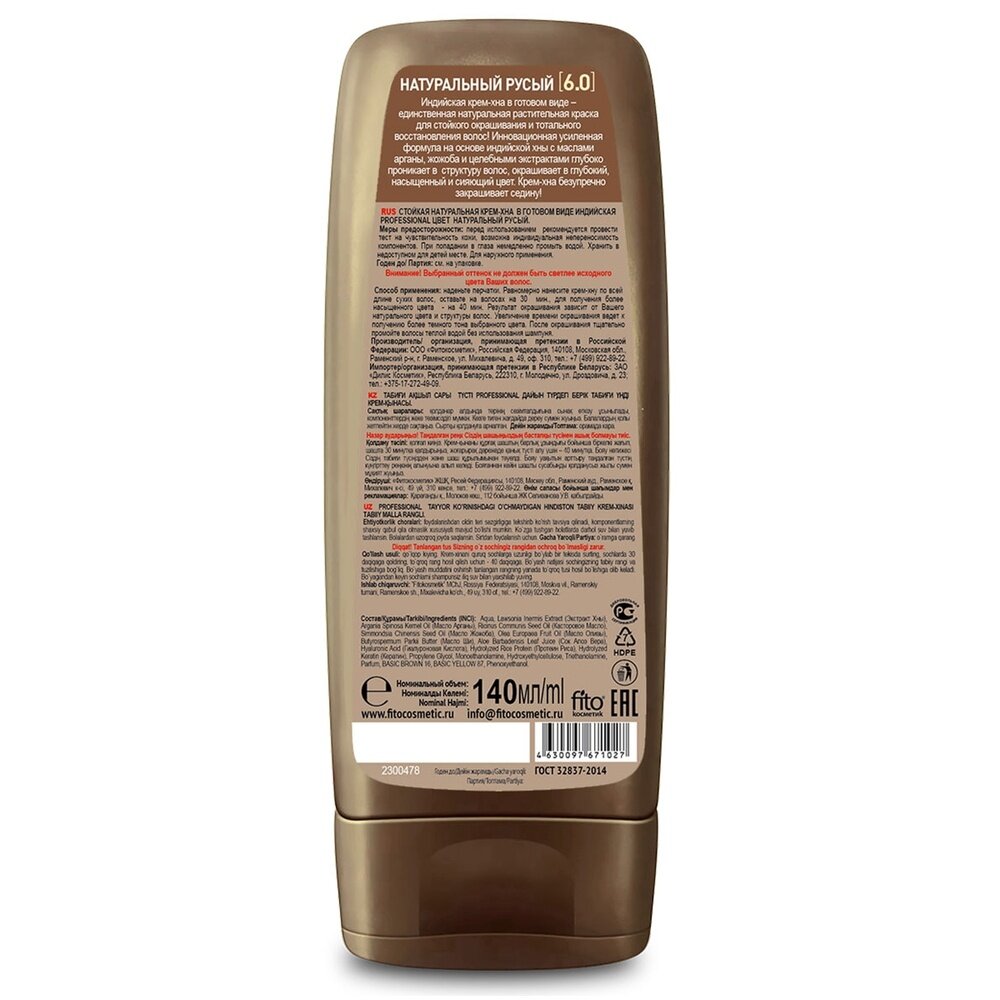 Fitoкосметик Крем-хна индийская натуральная в готовом виде, тон натуральный русый, 140 мл