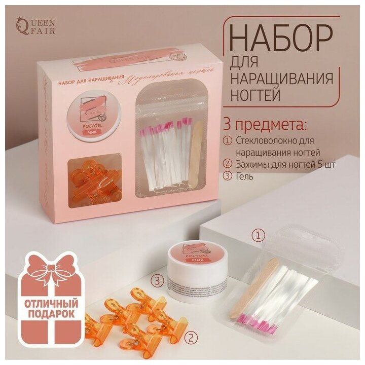 Купить Queen fair Набор для наращивания ногтей, 3 предмета: стекловолокно, зажимы, розовый гель