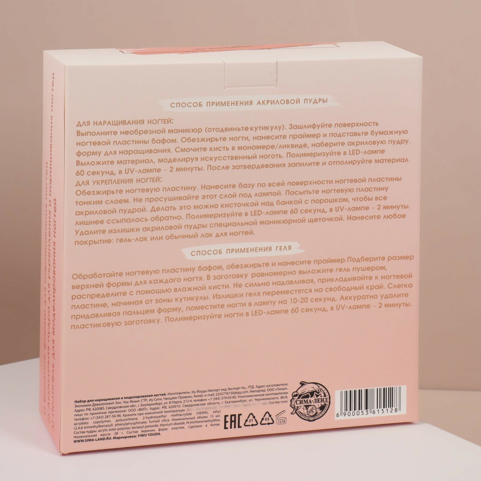 Набор для наращивания ногтей: верхние формы, розовая акриловая пудра, гель, в картонной коробке