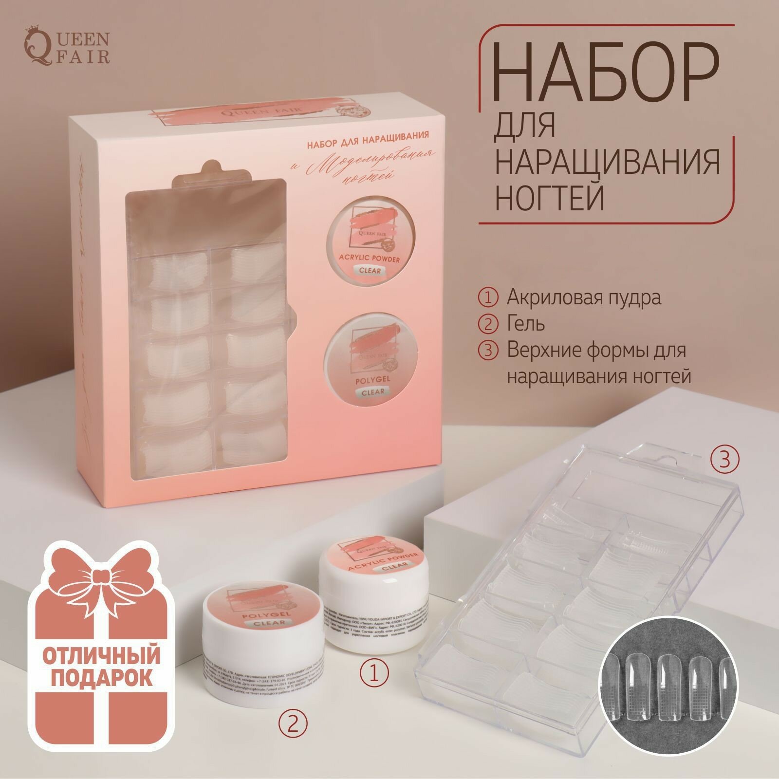 Купить Queen fair Набор для наращивания ногтей, 3 предмета: верхние формы, прозрачная акриловая пудра и гель