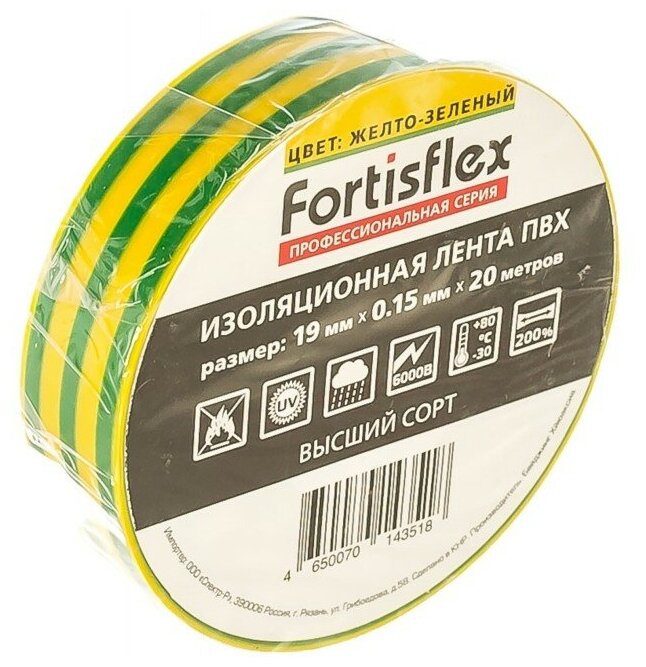 Fortisflex Изолента ПВХ 19х0.15х20 желто-зеленая
