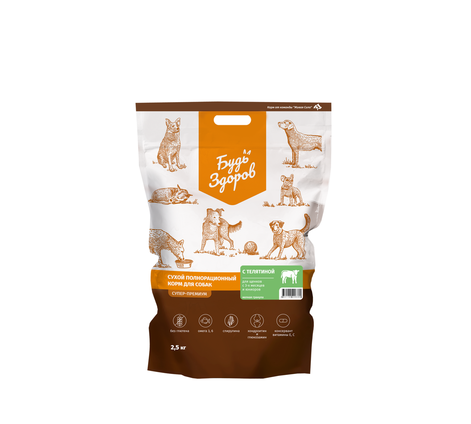 Будь ЗДОРОВ_ЖИВАЯ сила Корм для щенков с 3-х месяцев и юниоров c телятиной, Мелкая гранула (2,5 кг)
