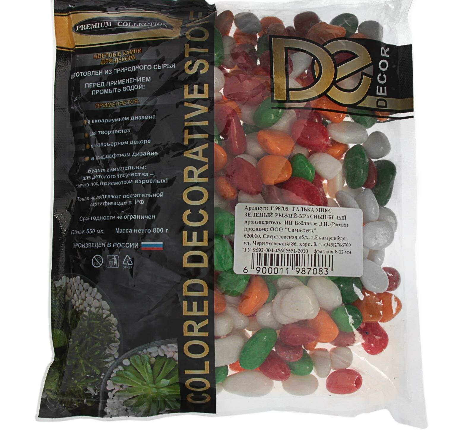 DECOR DE Грунт для аквариума "Галька цветная, зеленый-рыжий-красный-белый" 800г фр 8-12 мм