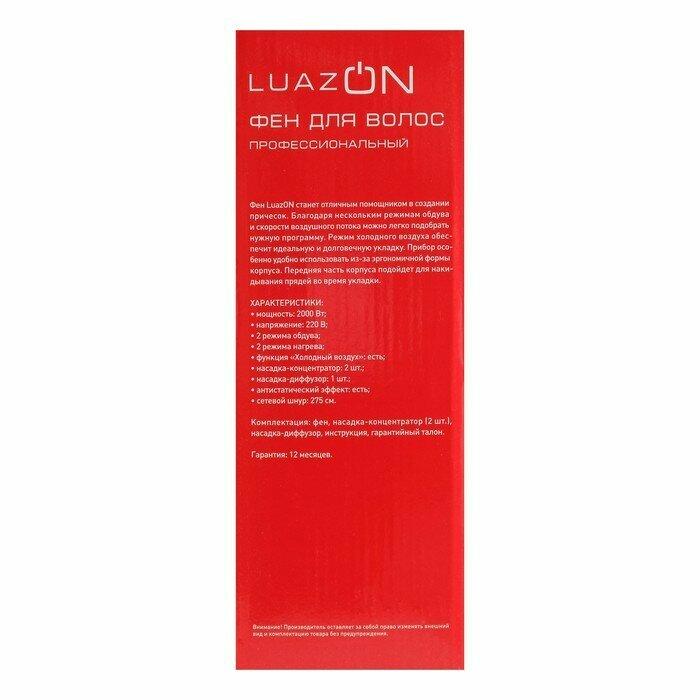 Купить Фен для волос Luazon Home LF-30, 2000 Вт, 2 температурных режима, 3 насадки, черный