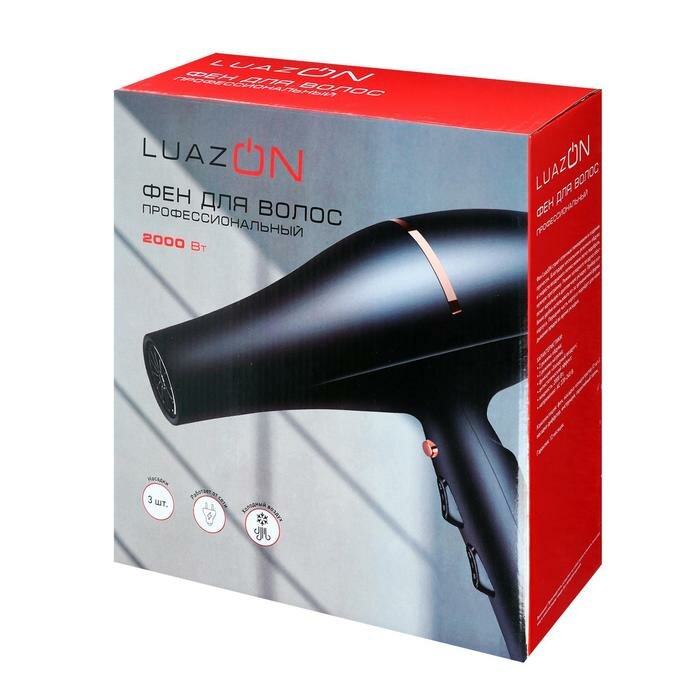 Luazon Home Фен LuazON LF-30, 2000 Вт, профессиональный, 2 темп. режима, 3 насадки, черный