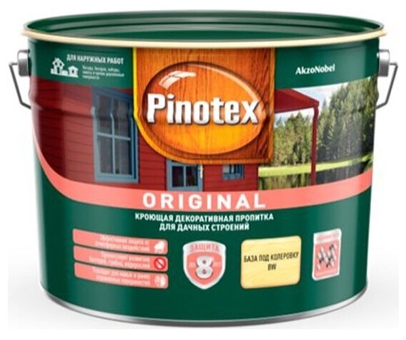 PINOTEX ORIGINAL пропитка декоративная кроющая для дачных строений и OSB, белая, база BW (9л)